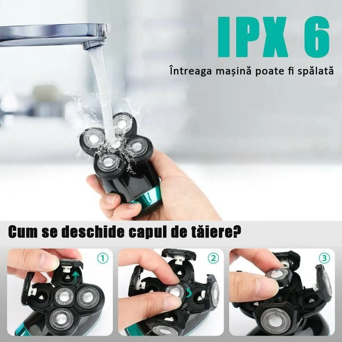 3.Design rezistent la apa: Usor de curatat, utilizare in mediu umed si uscat. Bucurati-va de ras in timpul dusului! Dupa utilizare, deschideti capul complet al lamei si clatiti aparatul sub apa curenta.