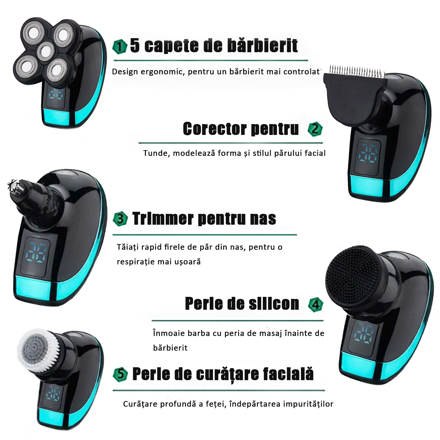 1.Cinci-in-unu aparat de ras si trimmer include:i aparat de ras, tunsori, aparat pentru taierea parului nazal, perie de curatare si perie de silicon. Design-ul rafinat satisface nevoile dvs. variate, oferind o solutie completa pentru ingrijire personala.