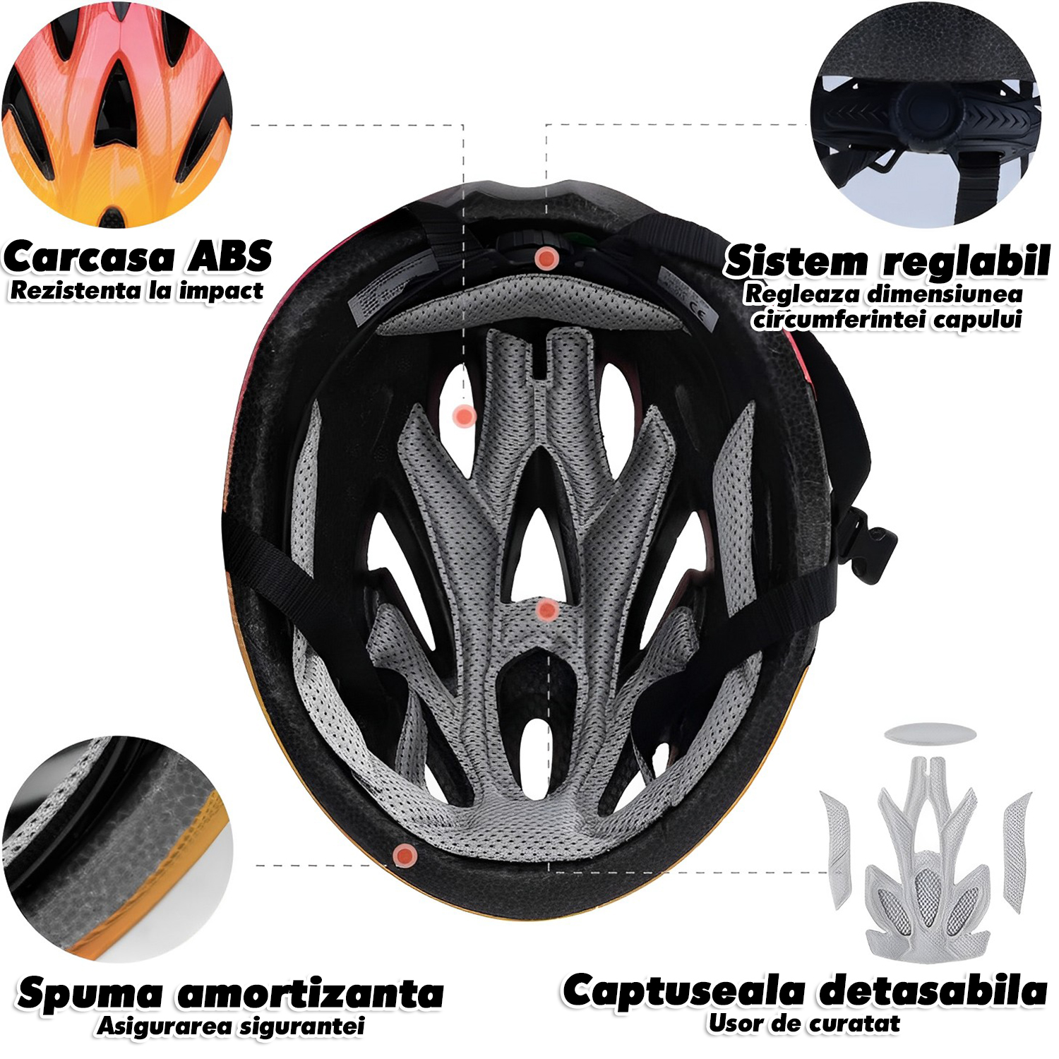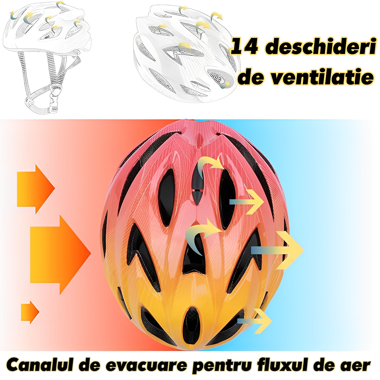 Casca Protectie Bicicleta, 52-58cm, pentru Copii 3-8 Ani, cu Sac de Depozitare, Ventilata, Securitate, pentru Bicicleta/Skateboard Conceputa pentru mers in siguranta: Aceasta casca bicicleta ofera protectie completa si confort pentru aventurile in aer liber. Carcasa sa din ABS si stratul interior ingrosat amortizeaza impacturile, in timp ce cele 14 orificii de ventilatie te mentin racoros. Potrivita pentru ciclism, patinaj cu role si alte sporturi, aceasta casca bicicleta este echipamentul ideal de siguranta pentru cei suficient de curajosi sa porneasca pe trasee montane. |