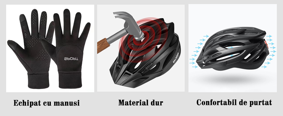 | Cadou surpriza: Cumpararea casca protectie vine cu manusi de ciclism de inalta calitate, oferind o ingrijire atenta pentru maini si imbunatatind nivelul general al echipamentului de ciclism.
