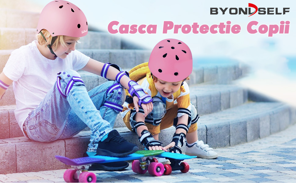 Casca Protectie Copii, BYONDSELF®, 8 Piese, 50-54CM, Purtati Echipamente de Protectie/Autocolante, Ventilata, pentru Copii 3-13 Ani, pentru Skateboard/Bicicleta, Roz