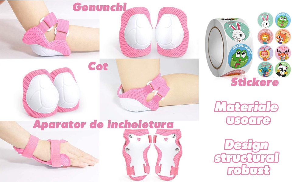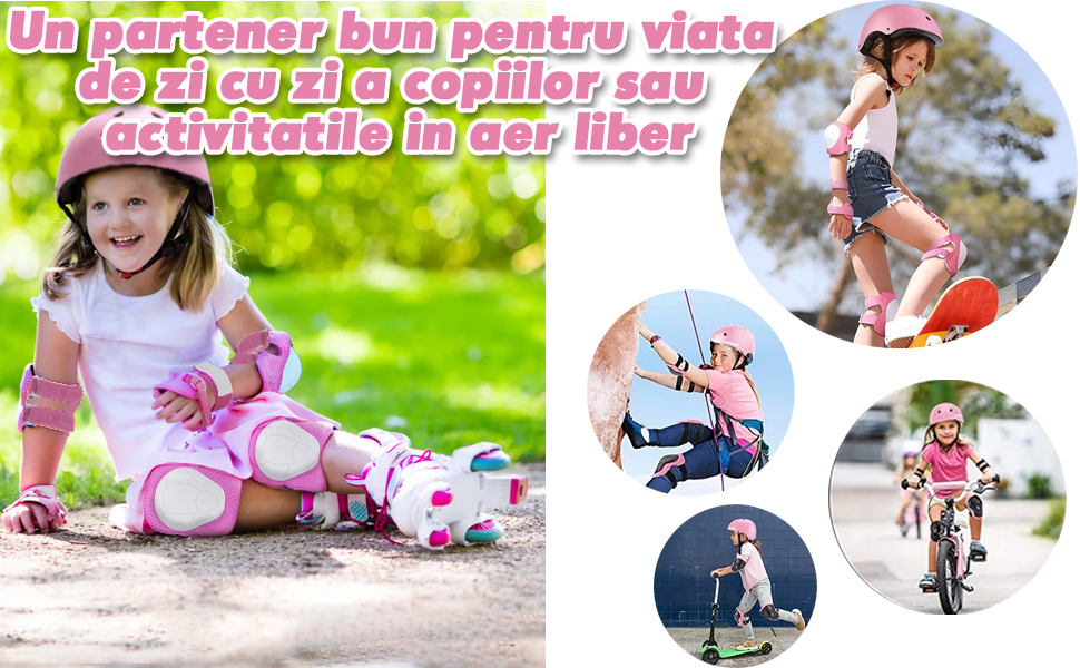 | Complet echipat: Set protectie pentru copii include o casca, o pereche de genunchi, o pereche de coturi si o pereche de perne de incheietura, toate proiectate cu materiale usoare si structuri robuste pentru a oferi protectie cuprinzatoare copiilor.