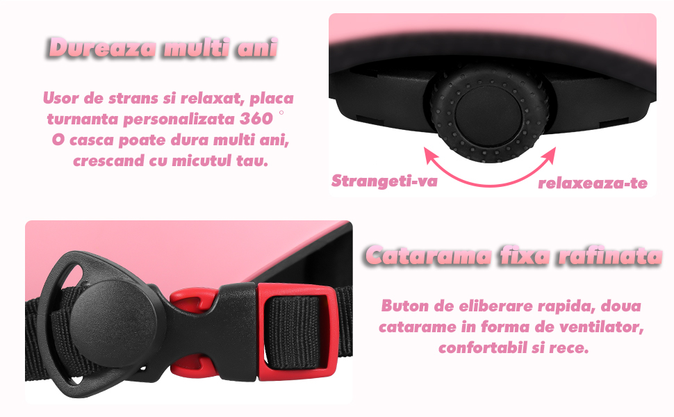 Prin rotirea butonului, casca poate fi usor stransa sau relaxata, obtinand o potrivire perfecta personalizata 360 de grade, asigurand ca o casca poate insoti copiii multi ani si se poate schimba odata cu cresterea lor. Designul cataramei fixe face purtarea mai convenabila si mai rapida, cu doar o apasare blanda pentru a finaliza operatiunea de deschidere si inchidere. |