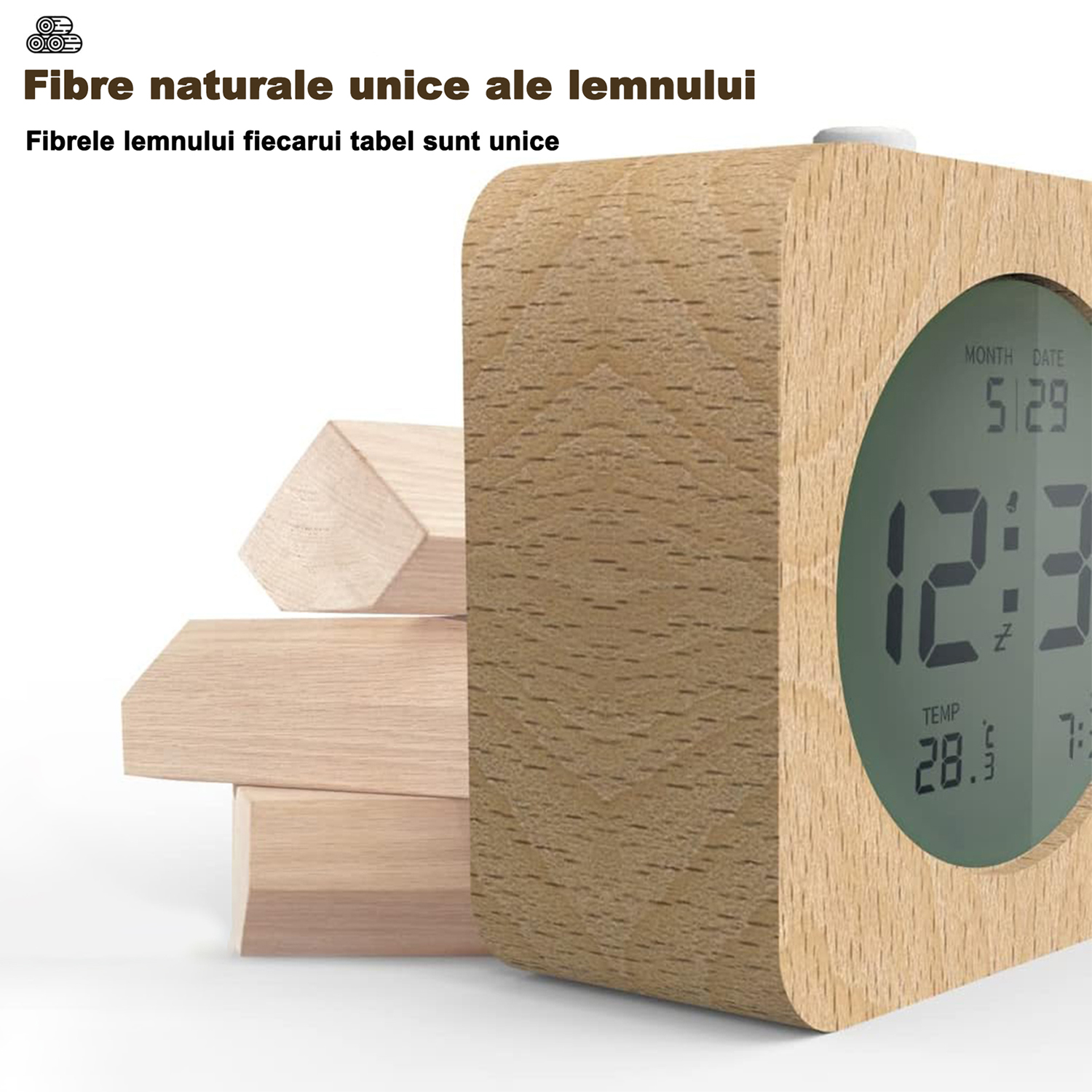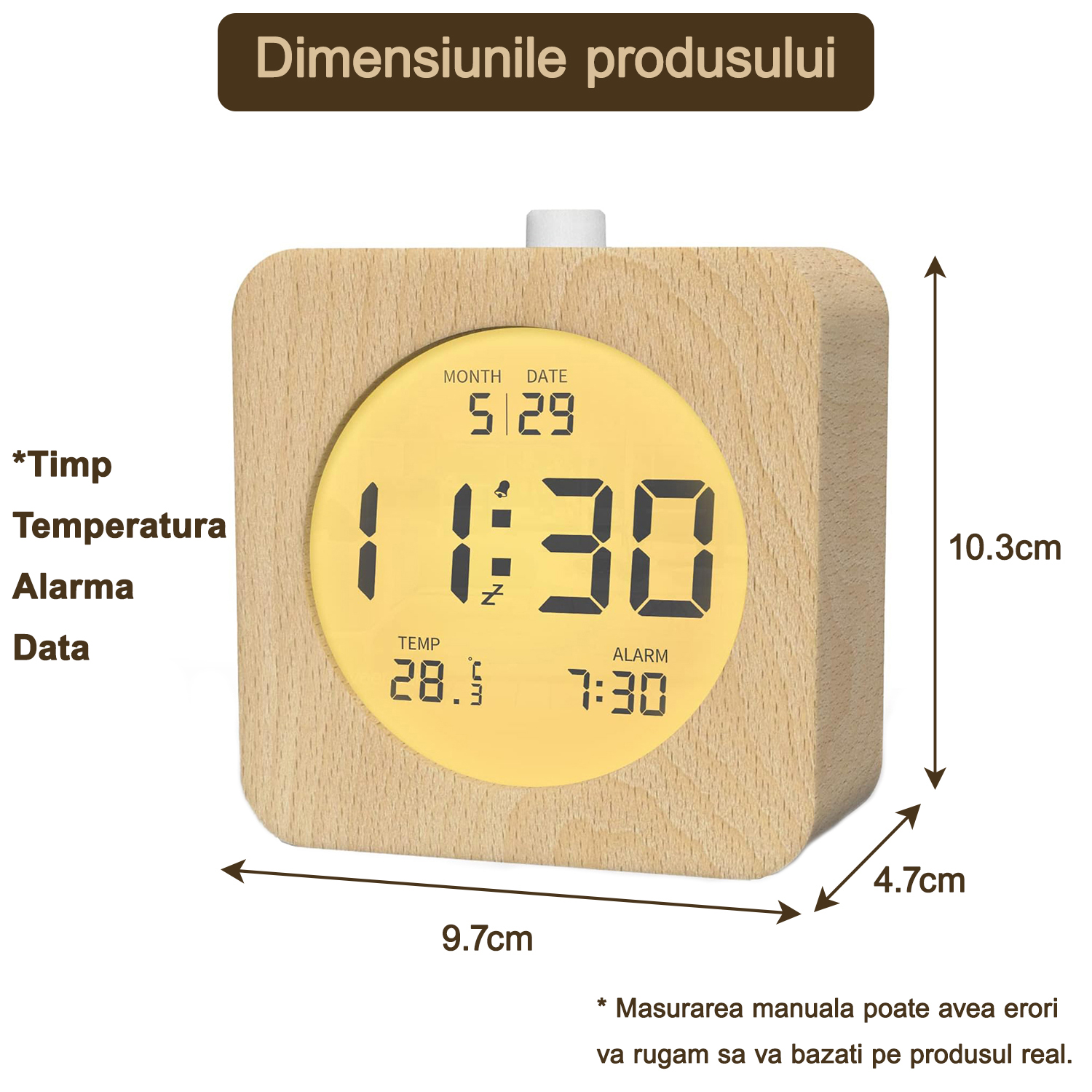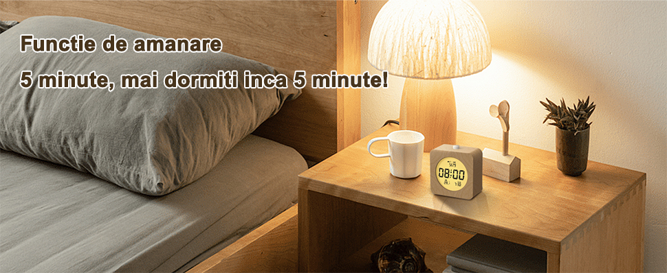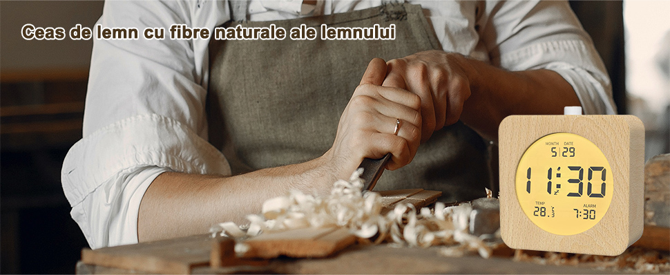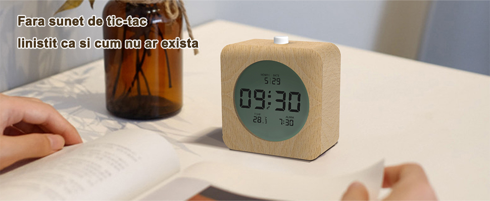 Cu designul sau elegant si clasic, acest ceas clasic din lemn se va potrivi cu o varietate de stiluri de decorare interioara, facandu-l complementul perfect pentru casa ta. Functioneaza silentios, asigurandu-se ca nu va deranjeaza somnul in timpul noptii, in timp ce functia sa de alarma este ideala pentru a va ajuta sa va treziti la timp. Functia de amanare este excelenta pentru cei care doresc sa doarma inca cateva minute dimineata. In plus, acest ceas de perete este echipat cu o lumina de fundal LCD pentru a se asigura ca ora si alte informatii pot fi citite clar intr-un mediu intunecat. Este un ceas multifunctional cu LED, potrivit pentru mediile de viata moderne.
