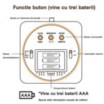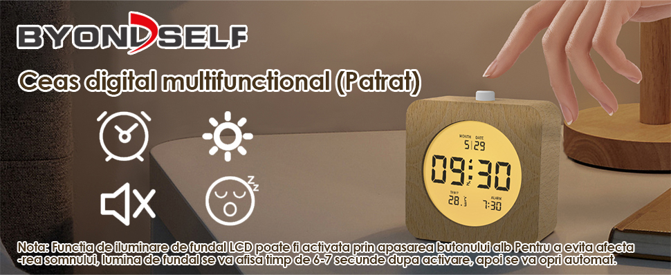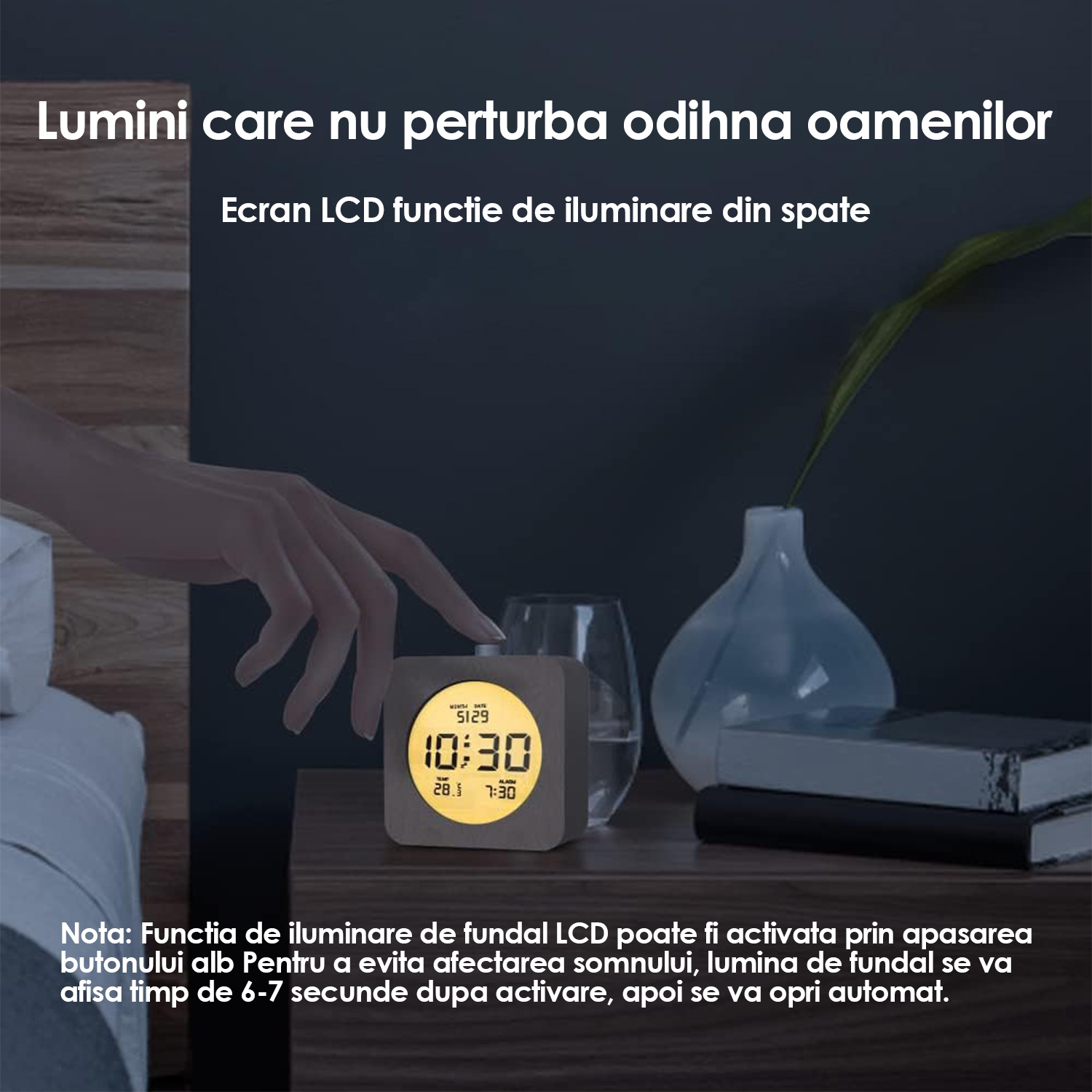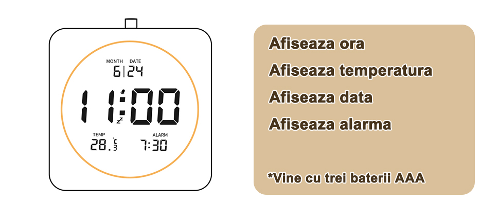 Nota: Functia de iluminare de fundal LCD poate fi activata prin apasarea butonului alb Pentru a evita afectarea somnului, lumina de fundal se va afisa timp de 6-7 secunde dupa activare, apoi se va opri automat. |