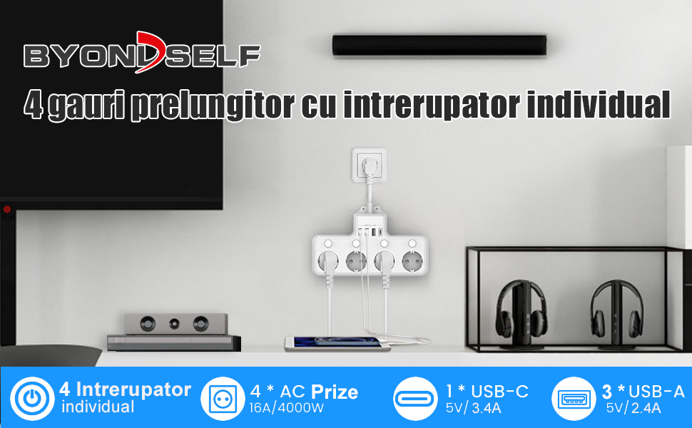 Prelungitor, BYONDSELF®, 4000W, 4 Prize, 3 USB-A, 1 USB-C, 18W Incarcare rapida, 4 Intrerupator Individuel, Alb