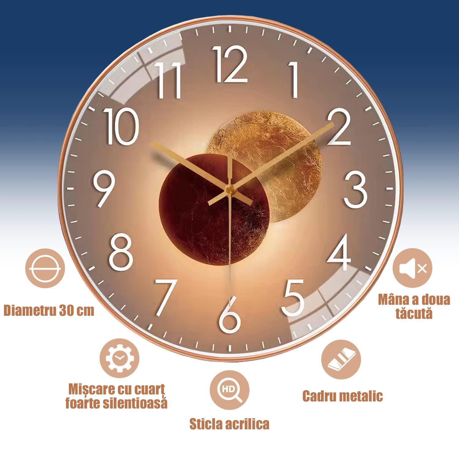 Ceas perete living, Silentios, 30cm, BYONDSELF®, Alimentat cu baterie, Auriu