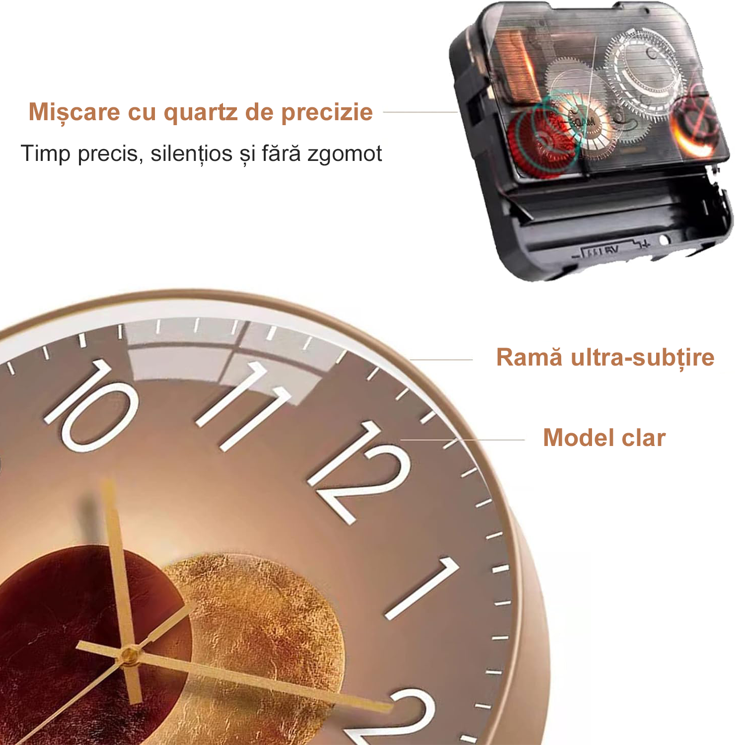 【HD si elegant】 capacul din sticla HD garanteaza o vedere perfecta. Cadranele frumoase cu potrivire perfecta a culorilor confera acestui ceas perete silentios un aspect literalmente atemporal.