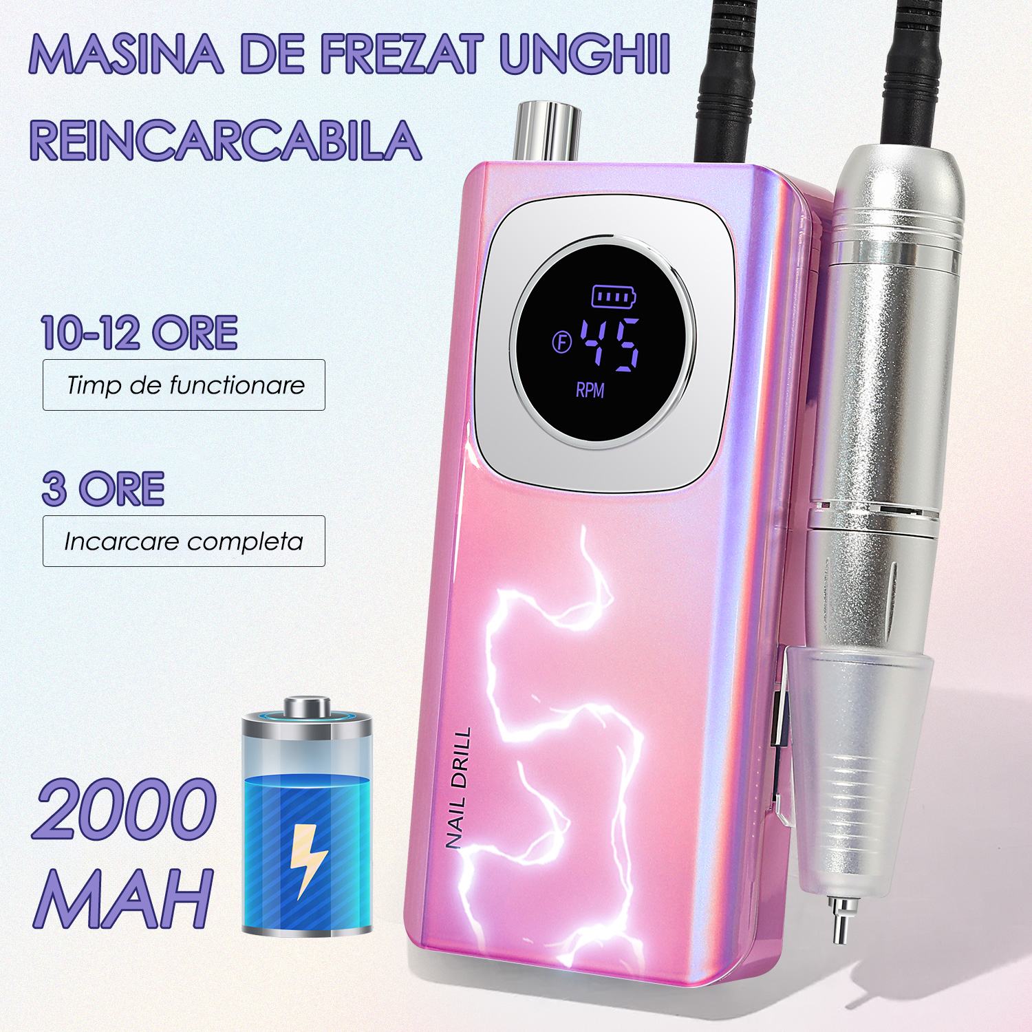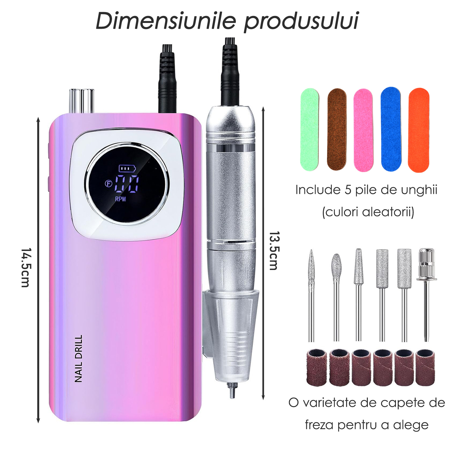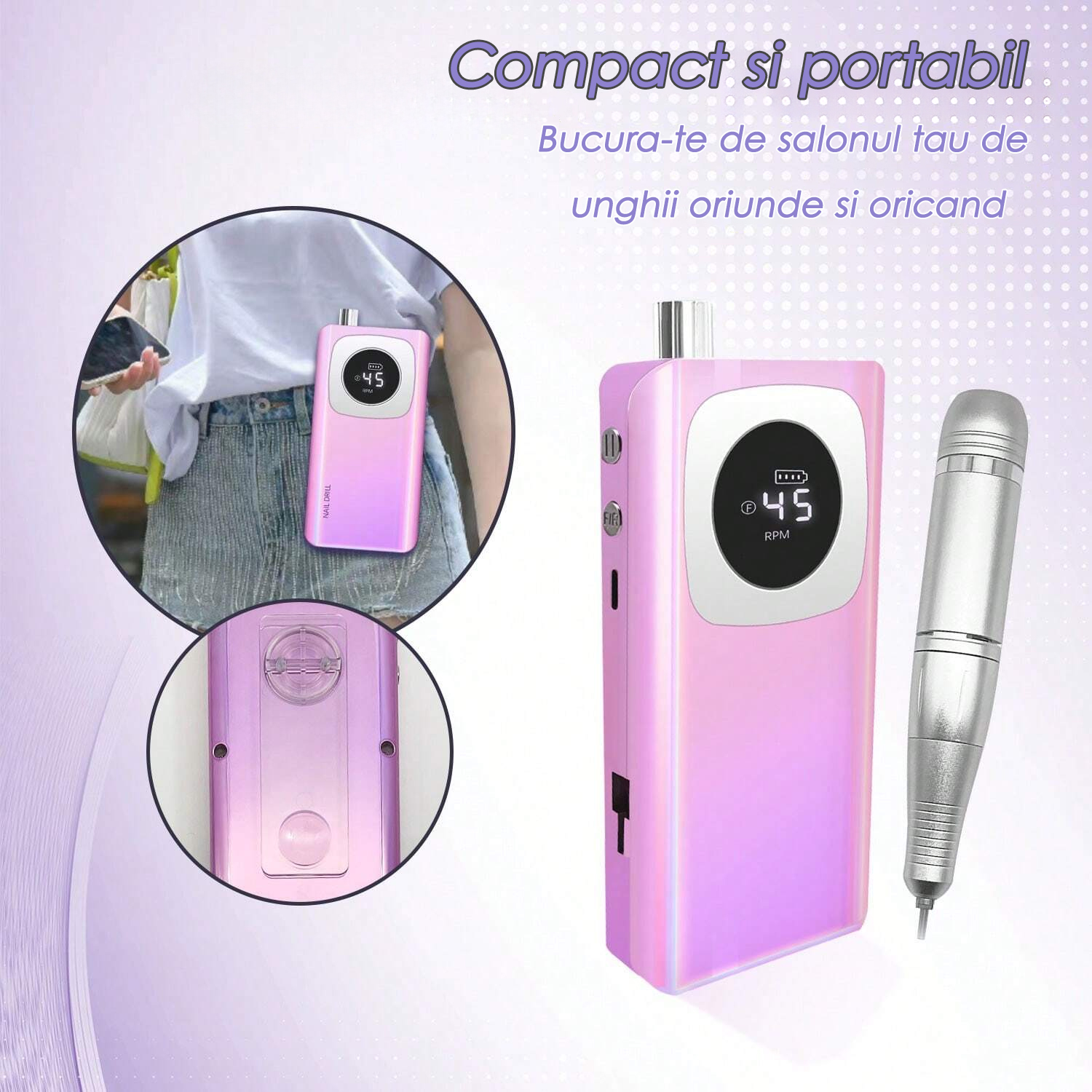 Freza Unghii Profesionala, BYONDSELF®, Portabil, 45000RPM, Manichiura, Slefuire, Lustruire, 2000mAh, Display LED Directia de rotatie/Puterea ramasa/Viteza, Cu Pila de Unghii, Mov