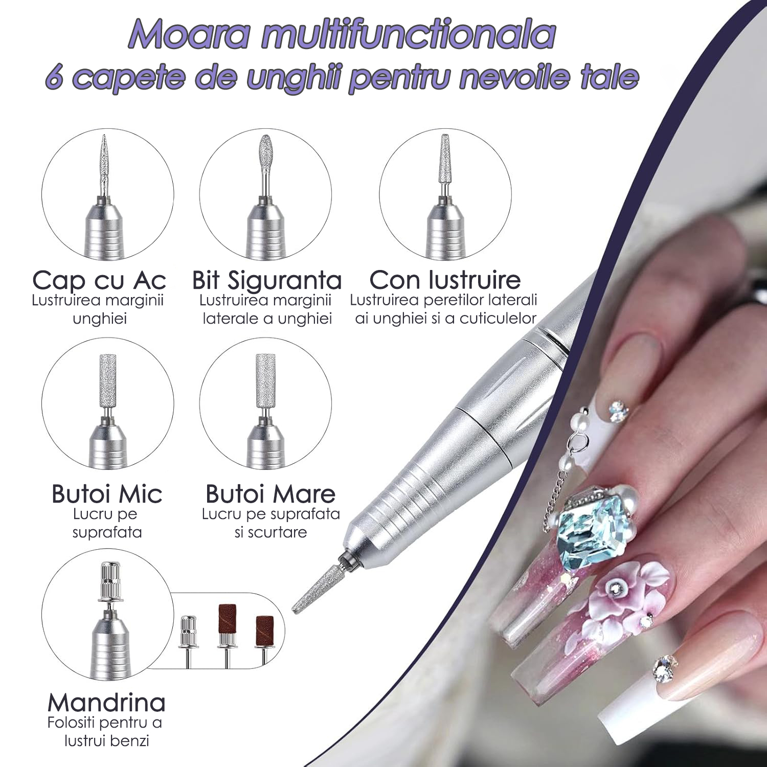 | 【Set complet de freze pentru unghii】 Aceasta freza unghii profesionala vine cu un set complet de accesorii pentru a acoperi toate nevoile tale de manichiura. Setul include sase capete diferite: cap freza in forma de ac, cap de siguranta, cap conic, tambur mic si tambur mare, precum si un suport special pentru tambur cu benzi abrazive. Pe langa acestea, mai sunt incluse 6 benzi abrazive si 5 pile pentru unghii in culori aleatorii, oferindu-ti flexibilitate si versatilitate in utilizare. De asemenea, aceasta freza manichiura se potriveste perfect pentru toate tipurile de unghii.【Viteza ridicata si performanta de top】 Cu un rulment de mare viteza, aceasta freza unghii profesionala poate atinge pana la 45000 RPM, fiind ideala pentru utilizare profesionala sau casnica. Tehnologia avansata garanteaza functionare cu caldura redusa, nivel de zgomot scazut si vibratii minime, ceea ce face aceasta pila electrica usor de folosit pentru perioade lungi de timp fara a obosi. Acum poti alege si varianta freza unghii electrica pentru un plus de confort. 【Usor de utilizat cu afisaj LCD】 【Portabila si cu baterie puternica】 |