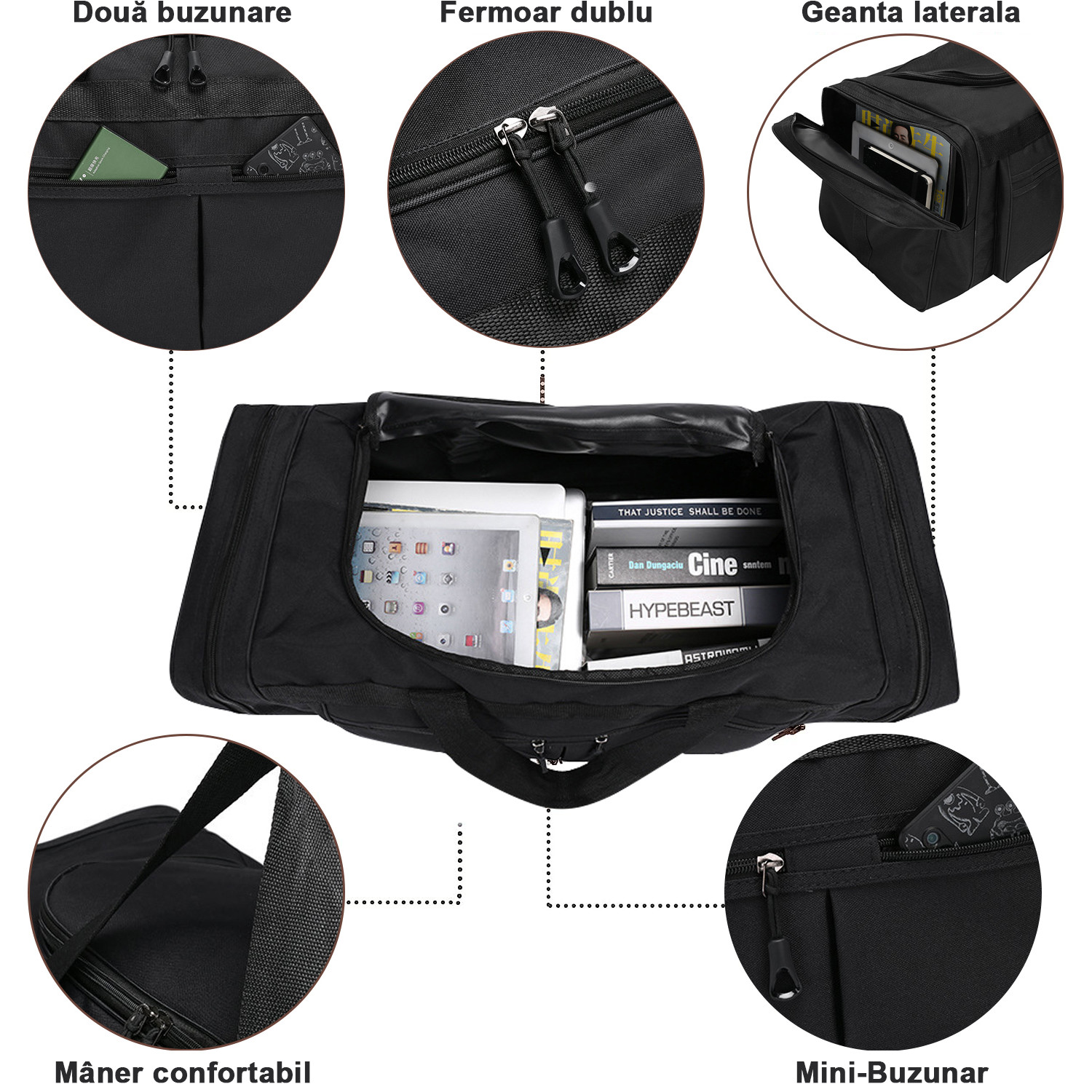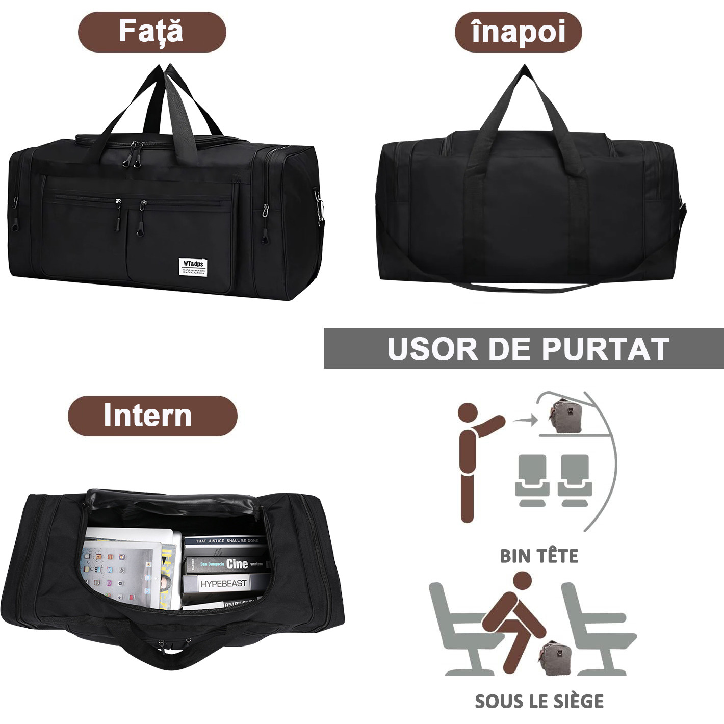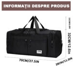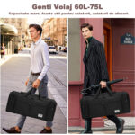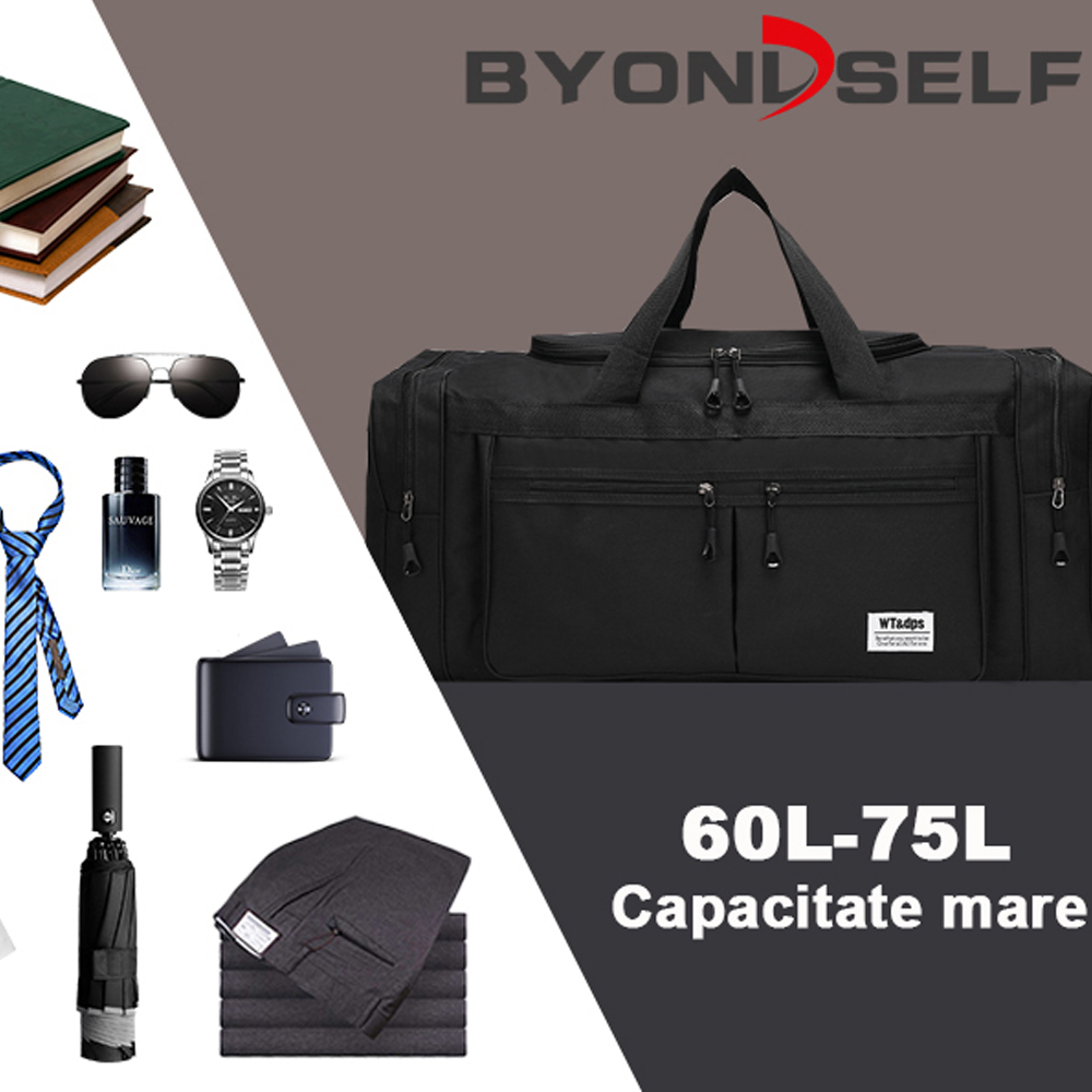 Genti voiaj 60L-75L, Sac de voiaj pliabil mare, BYONDSELF®, pentru calatorii cu avionul sau camping si drumetie, 70x28x32cm, Negru