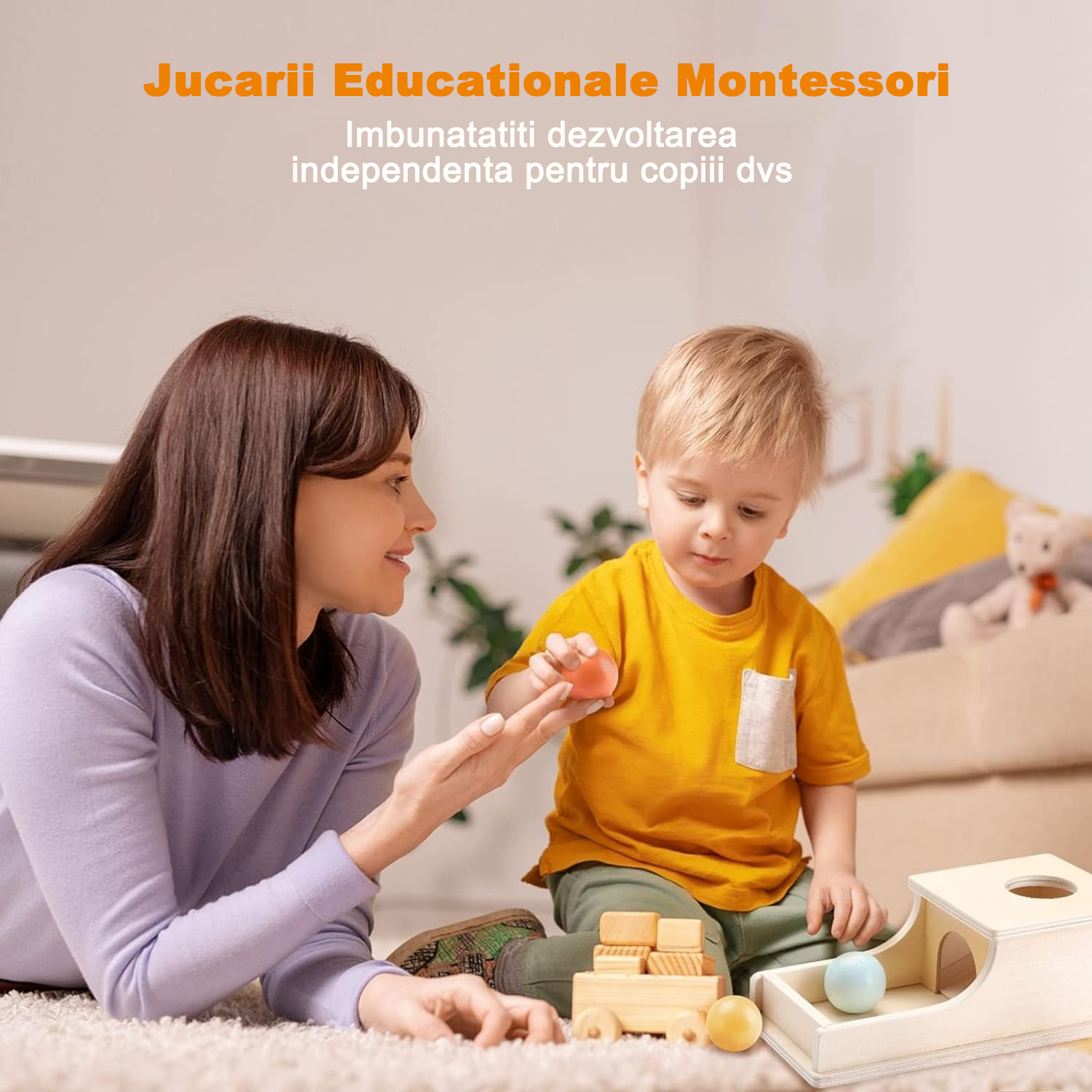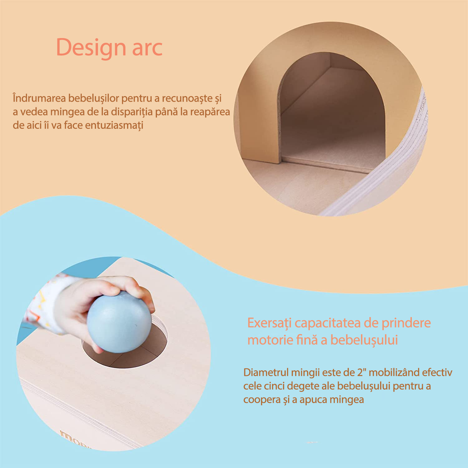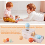 jucarii montessori:Aceasta jucarie de picatura cu minge practica o coordonare precisa mana-ochi si permite indirect copiilor sa experimenteze persistenta obiectelor. Trei bile solide de culori diferite pot stimula curiozitatea copiilor, pot aduce stimulare vizuala copiilor si pot promova dezvoltarea sistemelor senzoriale.
