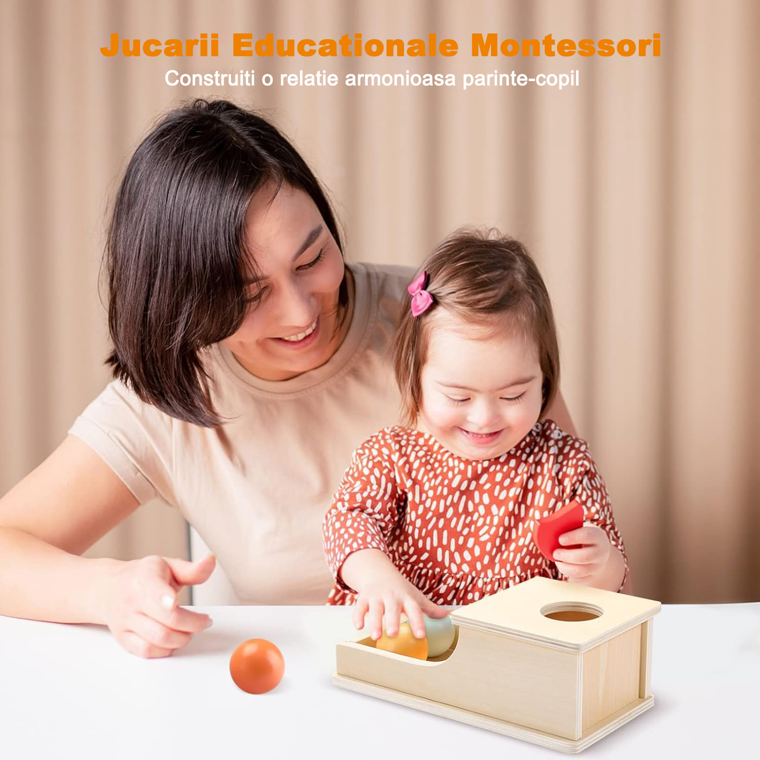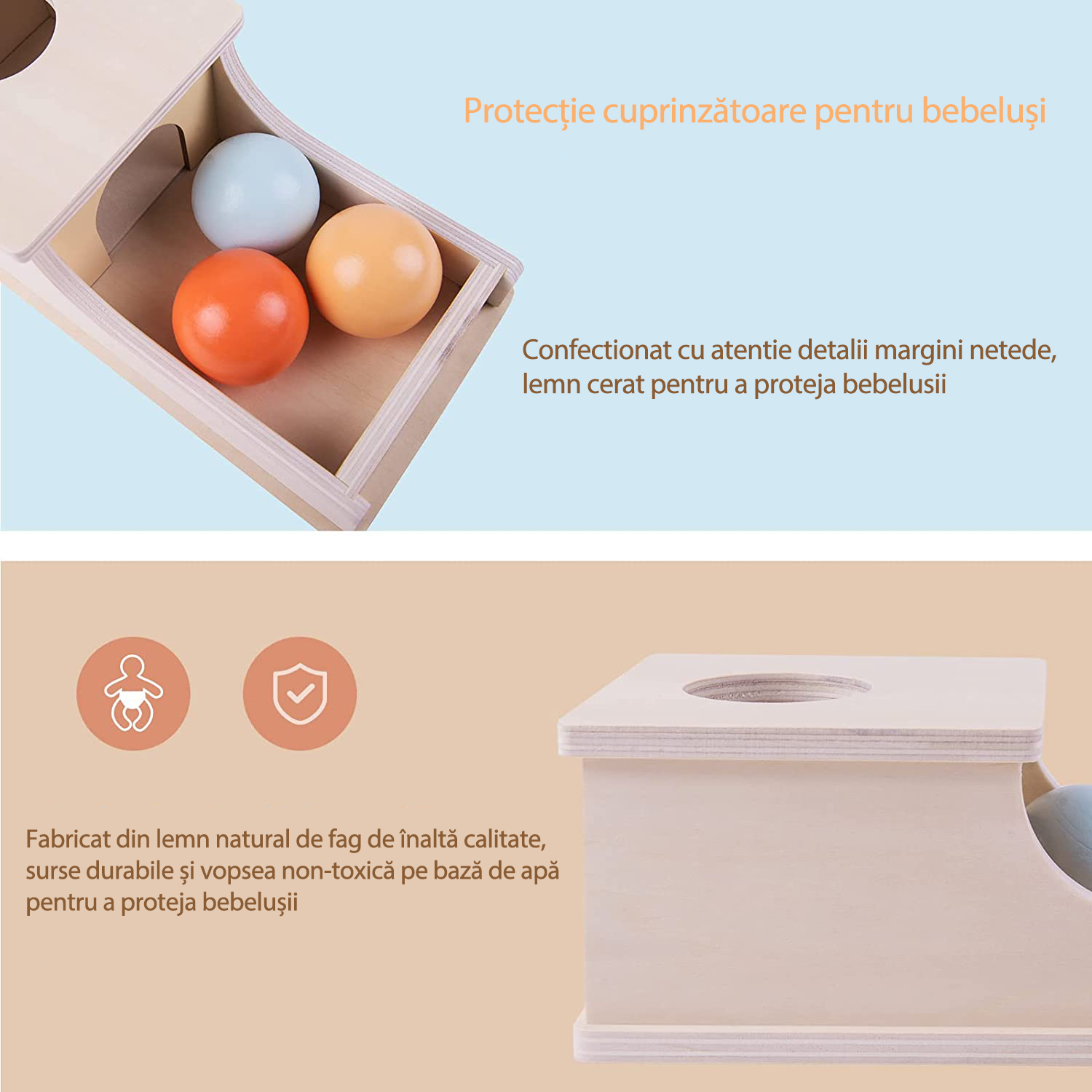 Cutia Permanenta Obiect cu Palet contine o cutie de lemn cu un palet si trei bile de lemn (lemn, albastru, portocaliu). Cutia de persistenta a obiectelor si mingea sunt dimensionate perfect pentru copiii cu varsta de 6 luni si 12 luni, mingea masurand 1,77 inci, care este dimensiunea perfecta pentru mainile celor mici.