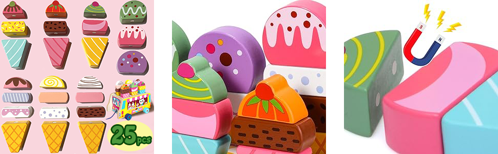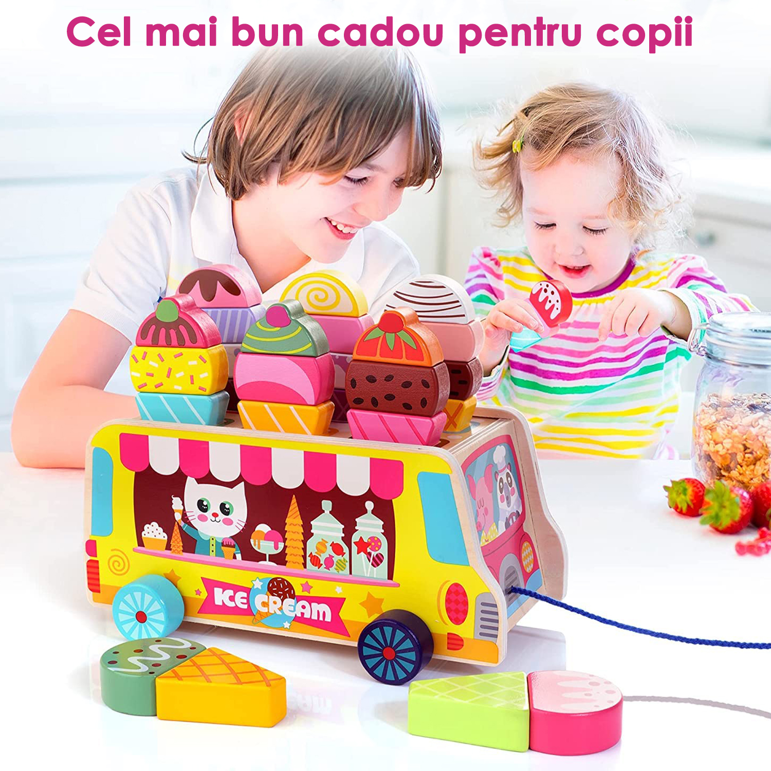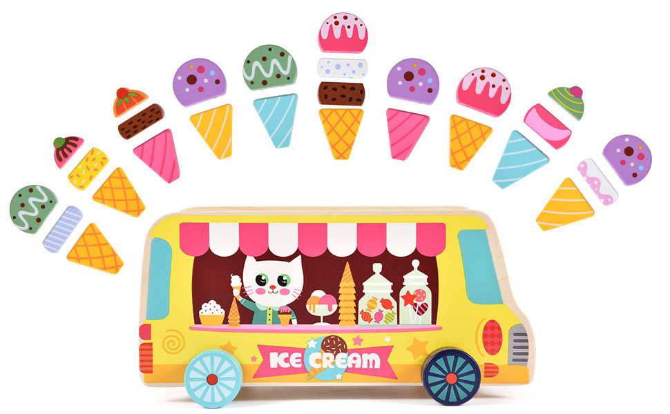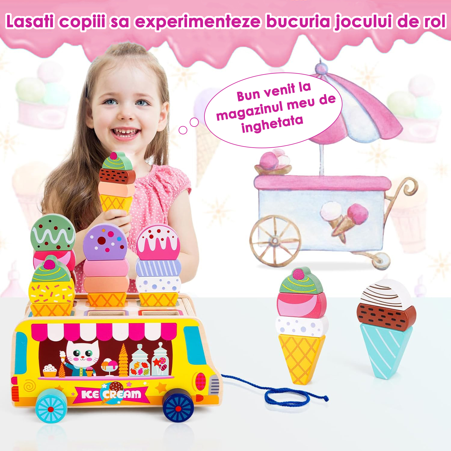 【Accesorii bogate】: Aceasta exceptionala jucarie de inghetata pentru copii include 24 de cuburi de inghetata colorate, 1 masina de inghetata din lemn si o cutie de cadouri frumoasa, satisfacand nevoile de interactiune zilnica ale copiilor.