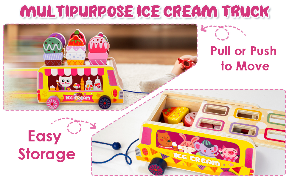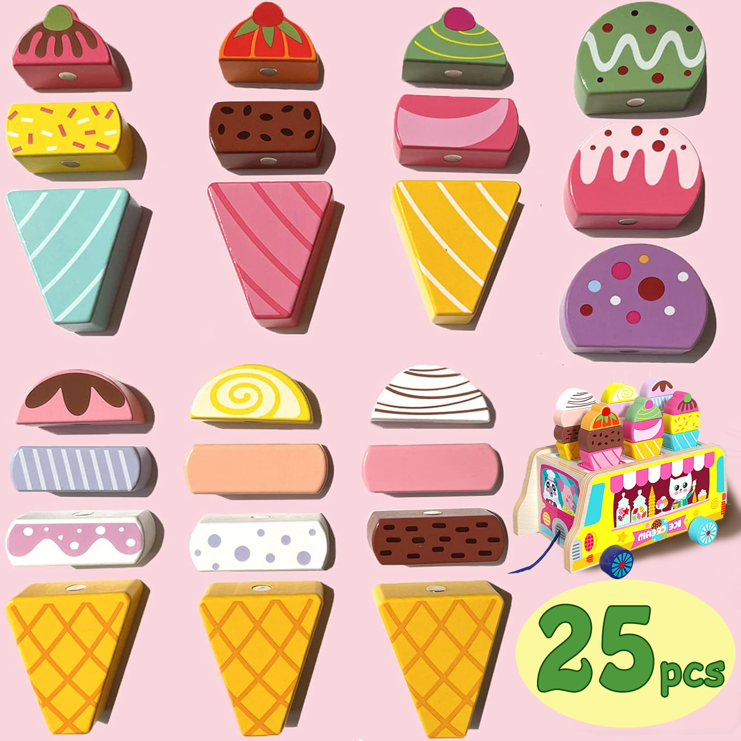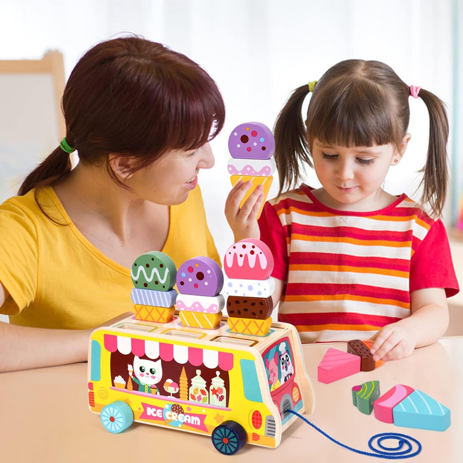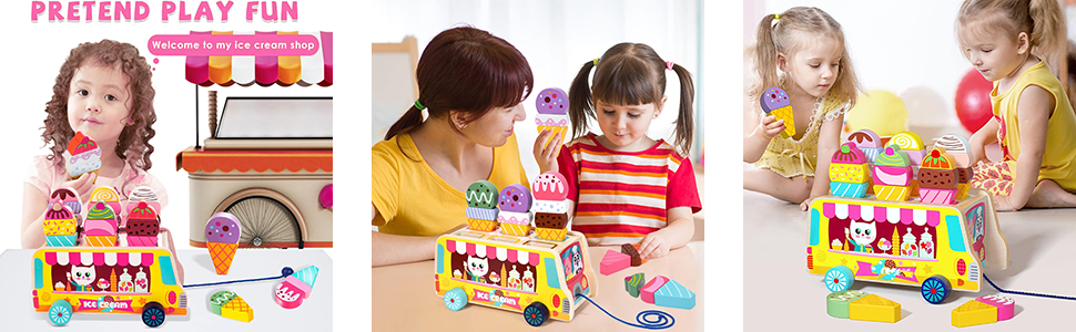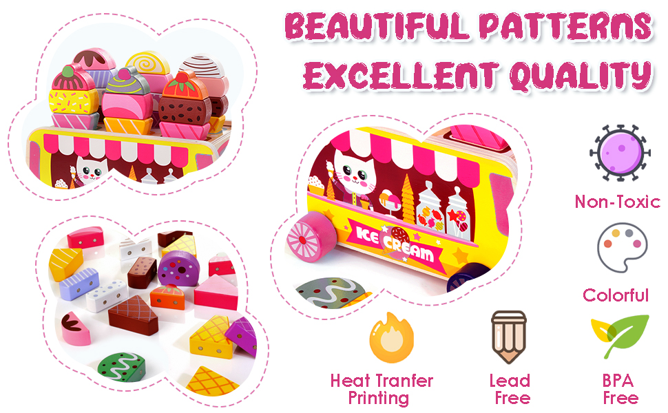 【Accesorii bogate】: Aceasta exceptionala jucarie de inghetata pentru copii include 24 de cuburi de inghetata colorate, 1 masina de inghetata din lemn si o cutie de cadouri frumoasa, satisfacand nevoile de interactiune zilnica ale copiilor.