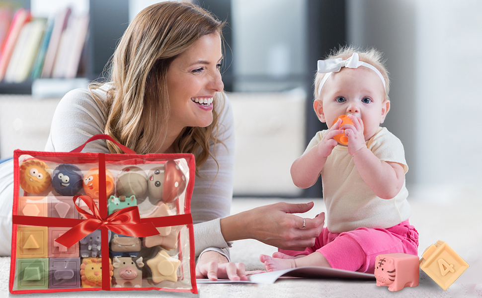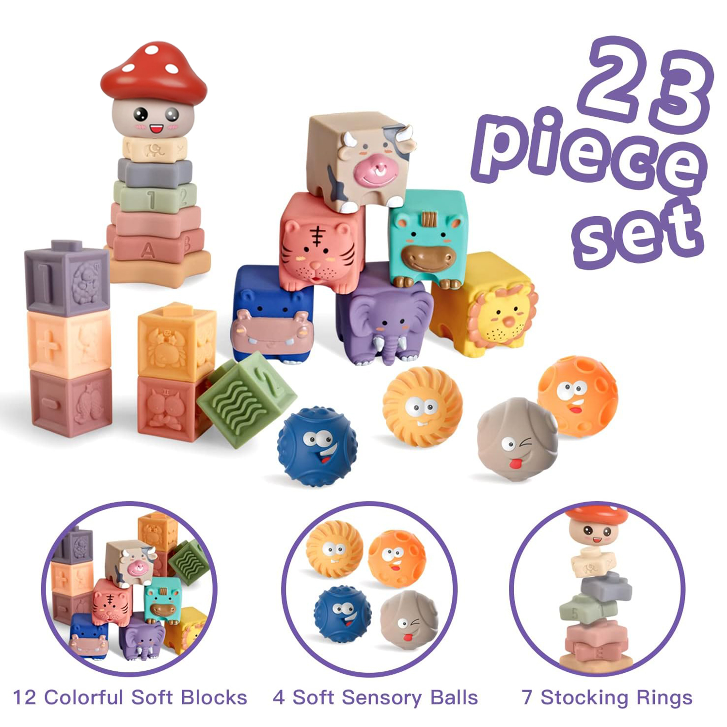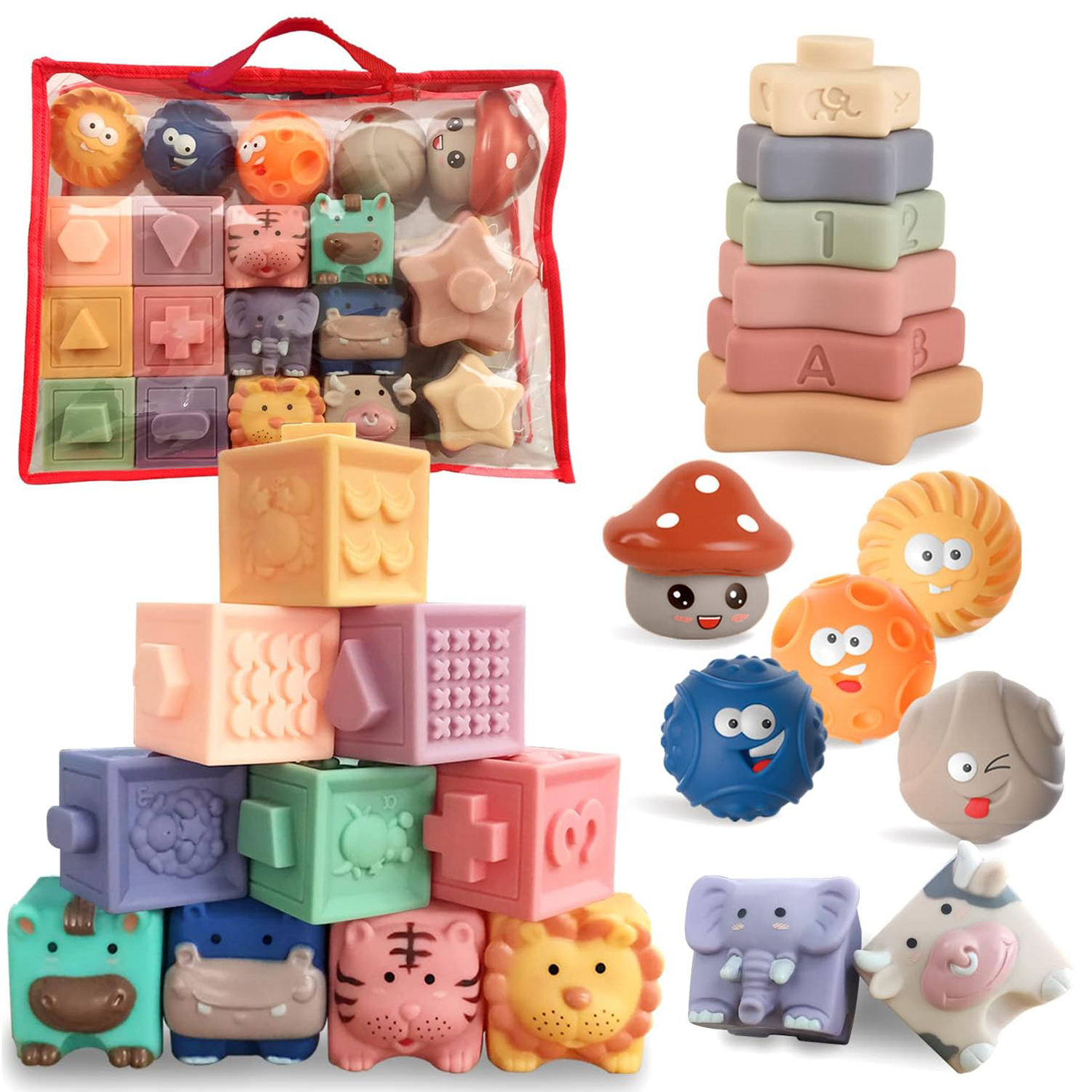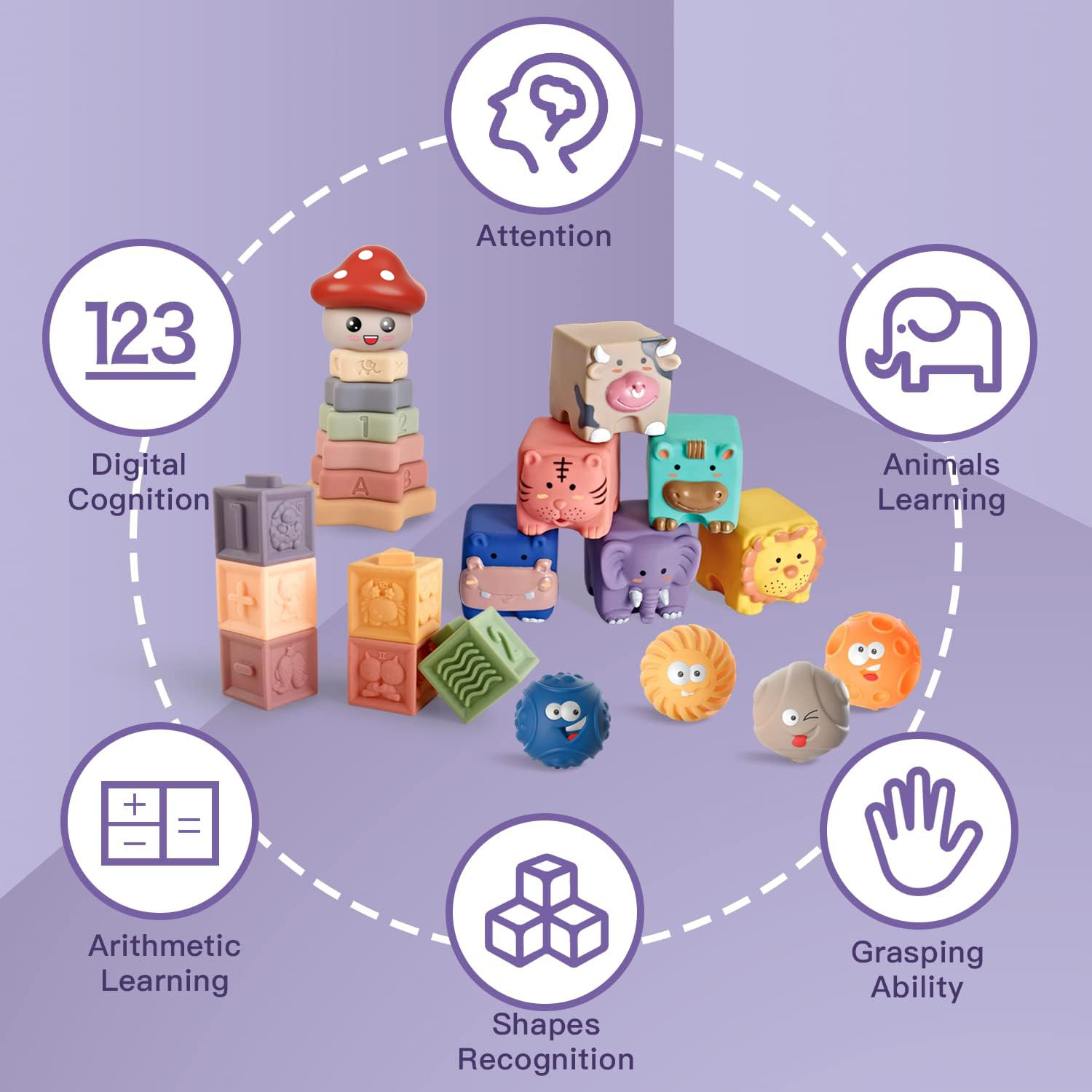 Conceput special pentru bebelusii cu varsta de 6-12 luni, aceste jucarii colorate, moi si mestecate nu sunt doar sigure (silicon alimentar, fara BPA), dar ii pot ajuta si pe bebelusi sa treaca peste micile probleme ale dentitiei. Ce este in set? Blocuri de stivuire, jucarii de stivuire cu tematica de animale, inele moi de stivuire si bile senzoriale, un total de 23 de piese, fiecare fiind un mic ajutor de invatare pentru copilul tau. Ei scot sunete scartaitoare adorabile si ii permit copilului sa invete culorile, formele si sa numere in timp ce se joaca. Curatarea este super usoara, doar fierbeti-l sau treceti-l prin masina de spalat vase, apoi stergeti-l si gata! Exista, de asemenea, o geanta convenabila de depozitare cu fermoar, care face depozitarea usoara si distractiva. Blocurile si mingile noastre in forma de animal sunt mai distractive decat alte jucarii si sunt parteneri buni pentru copilul tau pe masura ce creste! |