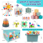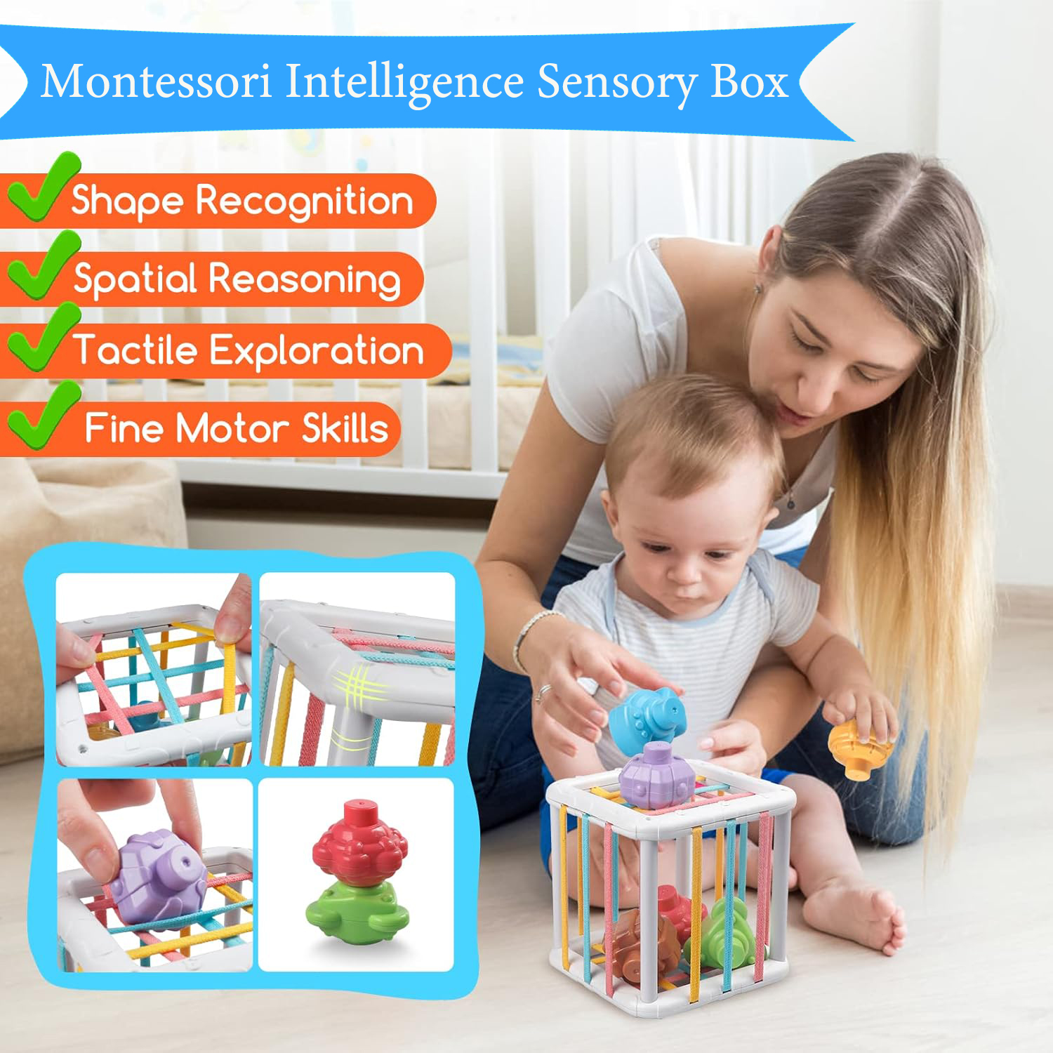 | Jucarii senzoriale Montessori: Contine un cub de blocuri cu benzi elastice colorate si 6 blocuri de diferite texturi, culori si forme. Bebelusii pot exersa apucarea, introducerea sau scoaterea blocurilor din cub, imbunatatindu-si simtul spatial, stimuland curiozitatea si ajutandu-i sa exploreze si sa experimenteze. |