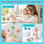 | Jucarii interactive cu ventuza: O jucarie cu o ventuza in partea de sus, cu trei forme diferite de animale dragute: albina, fluture si buburuza. Scoate un sunet de clic atunci cand este agitata pentru a atrage atentia bebelusului. Poate fi atasata ferm pe orice suprafata plana si se roteste foarte rapid.
