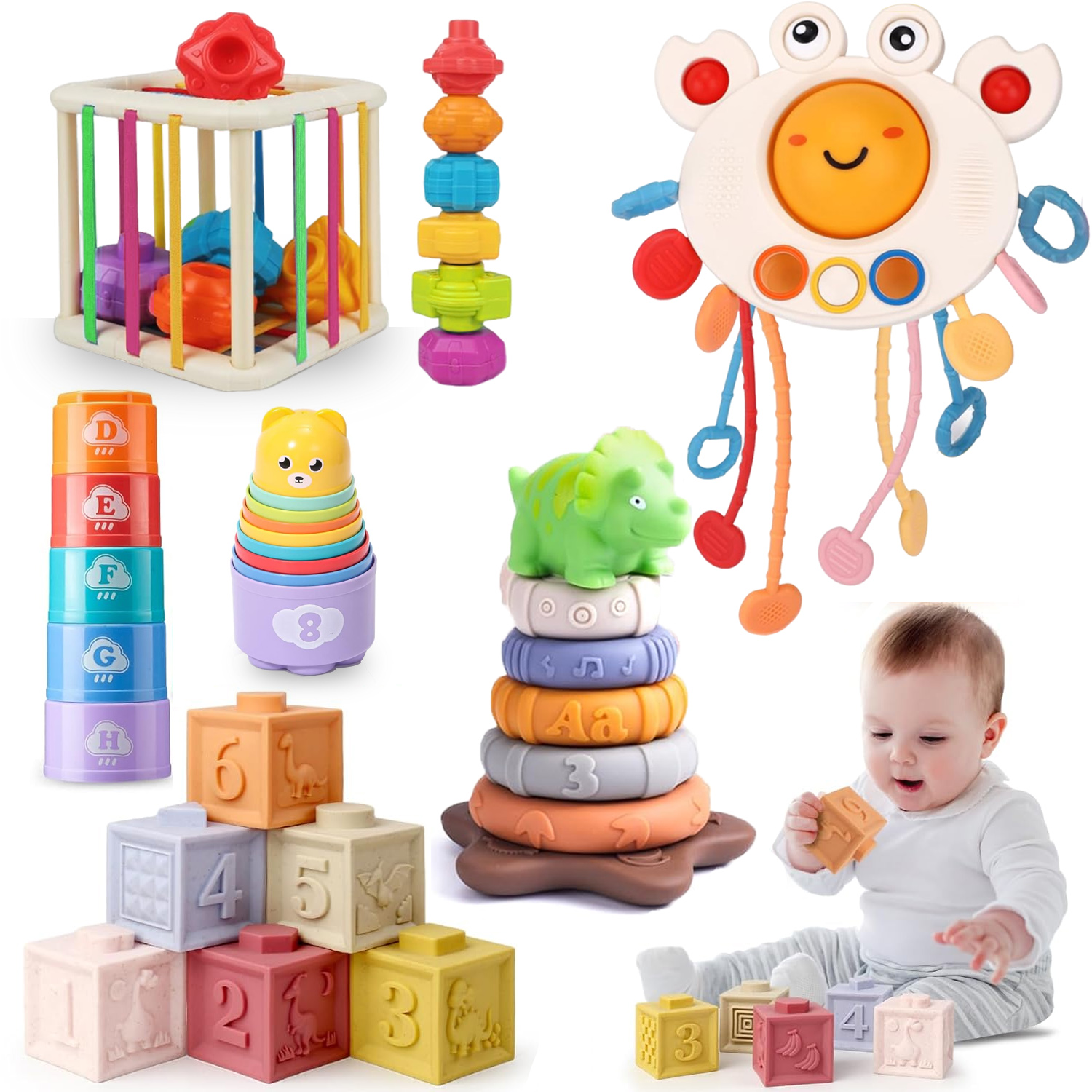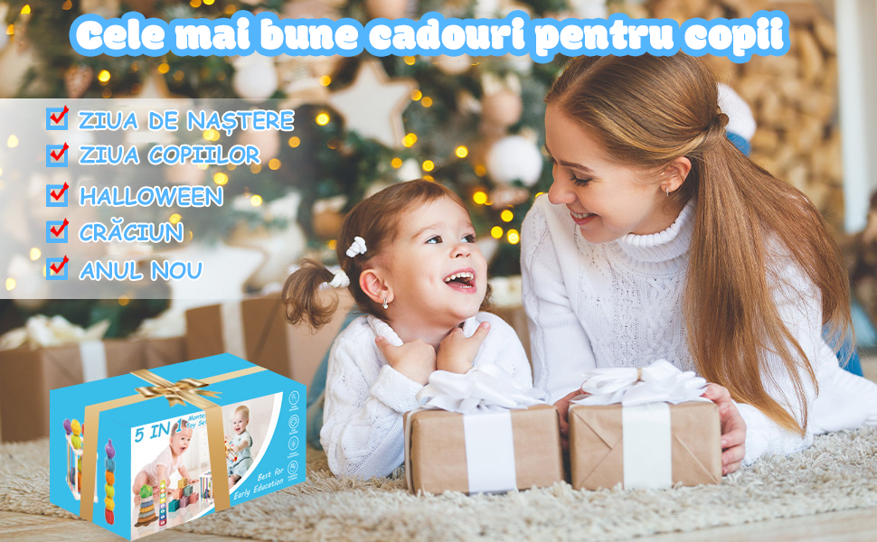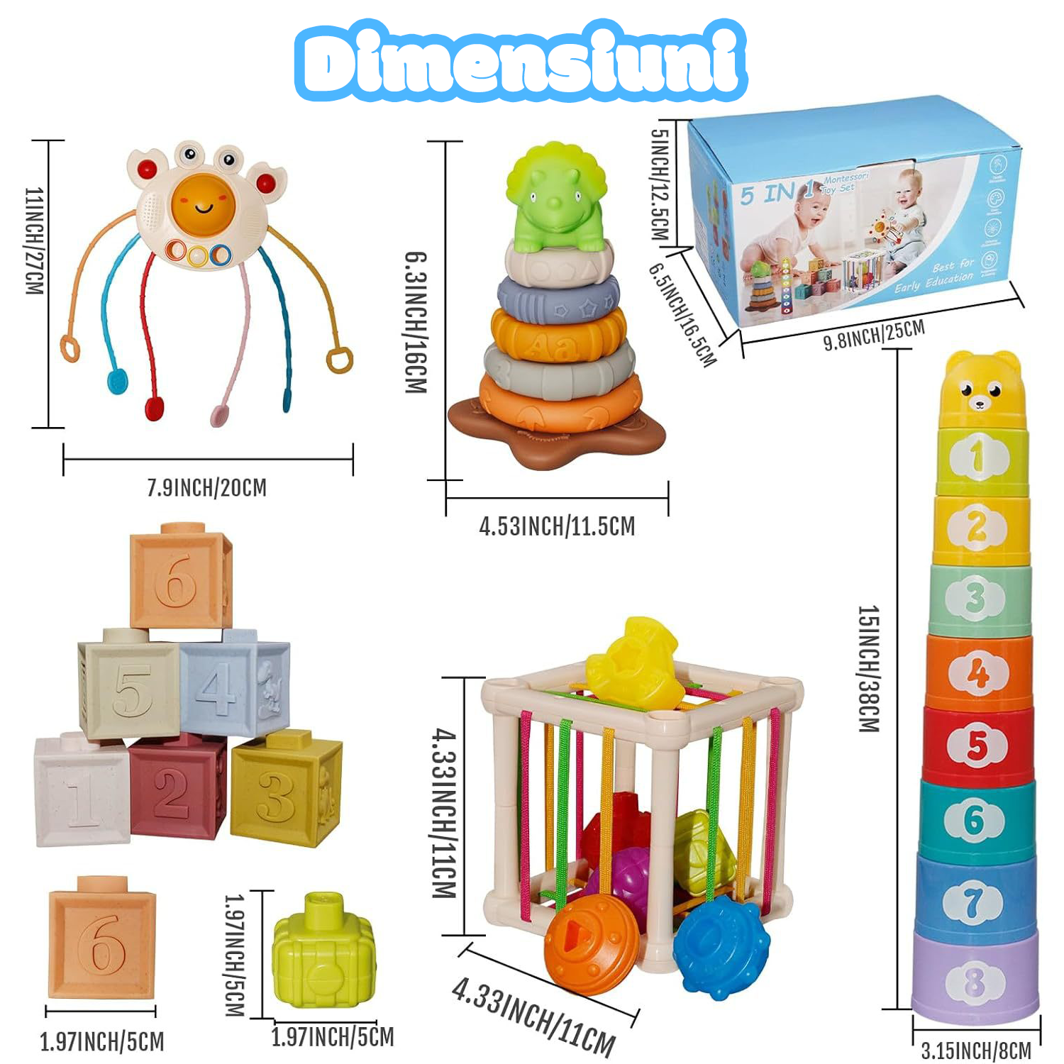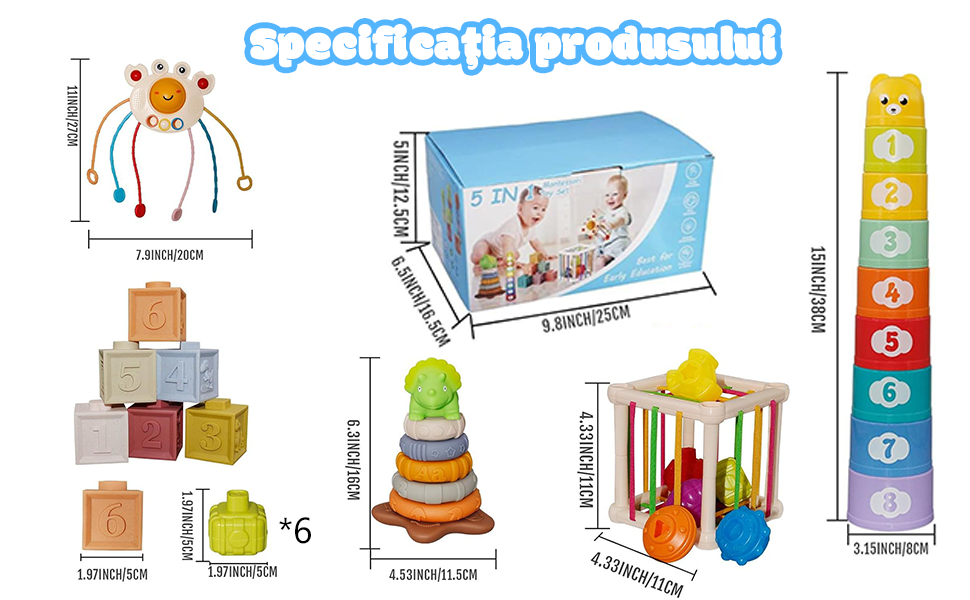 Setul Jucarii interactive bebelusi contine 6 blocuri de constructie moi, 7 inele moi de stivuire dinozauri, 9 pahare colorate de stivuire, 1 jucarie senzoriala in forma de crab, 1 cub senzorial de explorare cu 6 blocuri.Cu o cutie de culoare rafinata, toate accesoriile sunt bine ambalate in interiorul acesteia. Este portabil pentru calatorii. Bebelusii se pot juca in masina si cu avionul. |