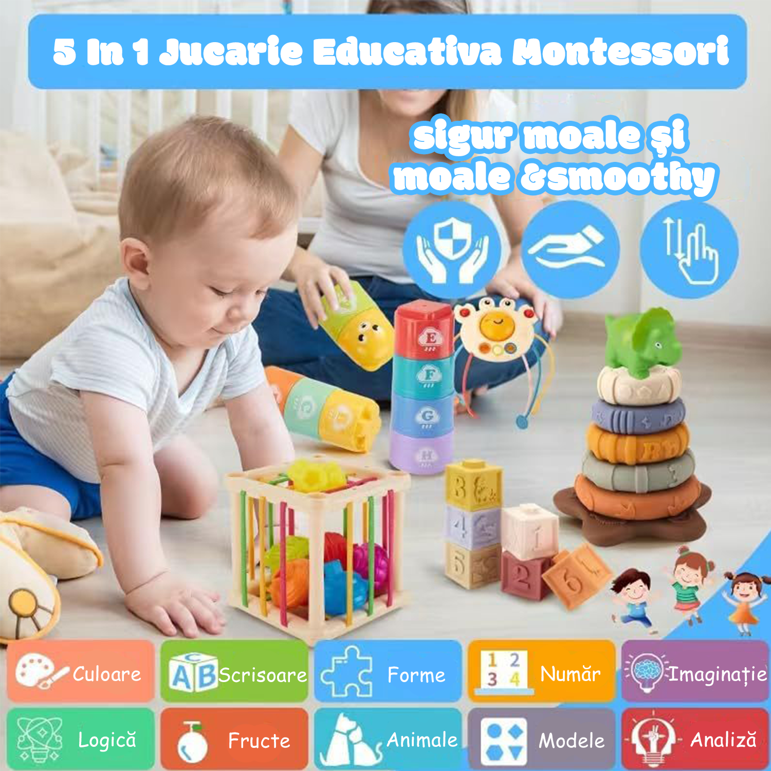 5 In 1 Jucarie Educativa Montessori din Silicon, BYONDSELF®, Jucarie Dentitie Senzoriala Bebelusi, cu Litere, Numere, Modele, Forme, Culori |