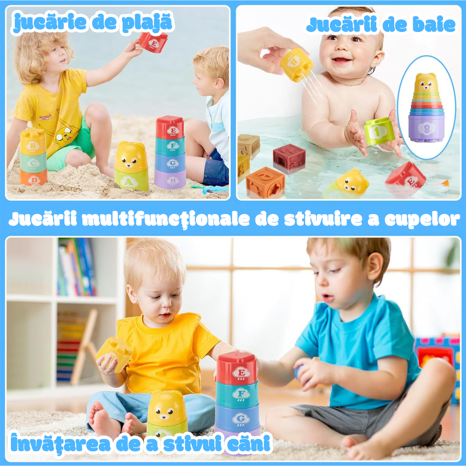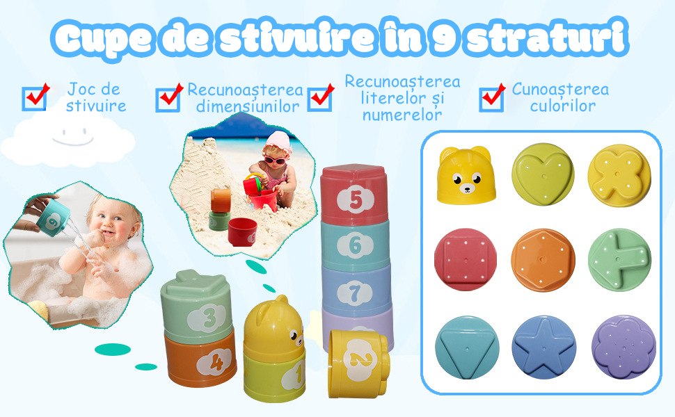 [Cupe de stivuire in 9 straturi] Cupele de stivuire colorate pot fi folosite in multe tipuri de joaca, cum ar fi: stivuire, cuib, sortare forme, diferentierea dimensiunilor, jucarii de baie, jucarii de plaja si multe altele. |
