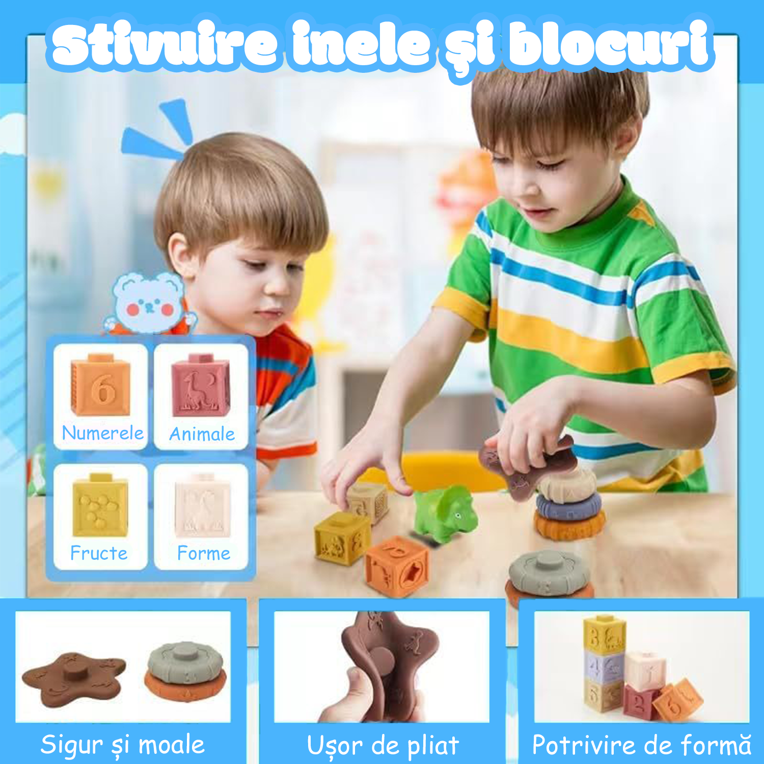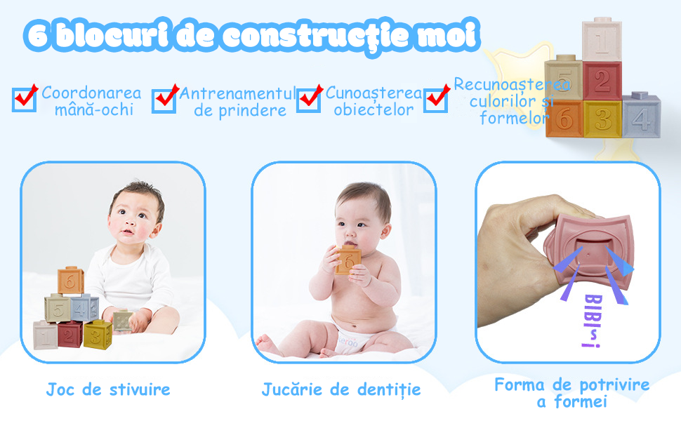 [Blocuri de constructie moi] Blocurile moi sunt concepute cu modele, fructe, forme si potriviri grafice potrivite pentru ca bebelusii sa invete diferite abilitati; designul din silicon moale este potrivit pentru ca bebelusii sa apuce si sa roada, insotind bebelusii in perioada de dentitie. |