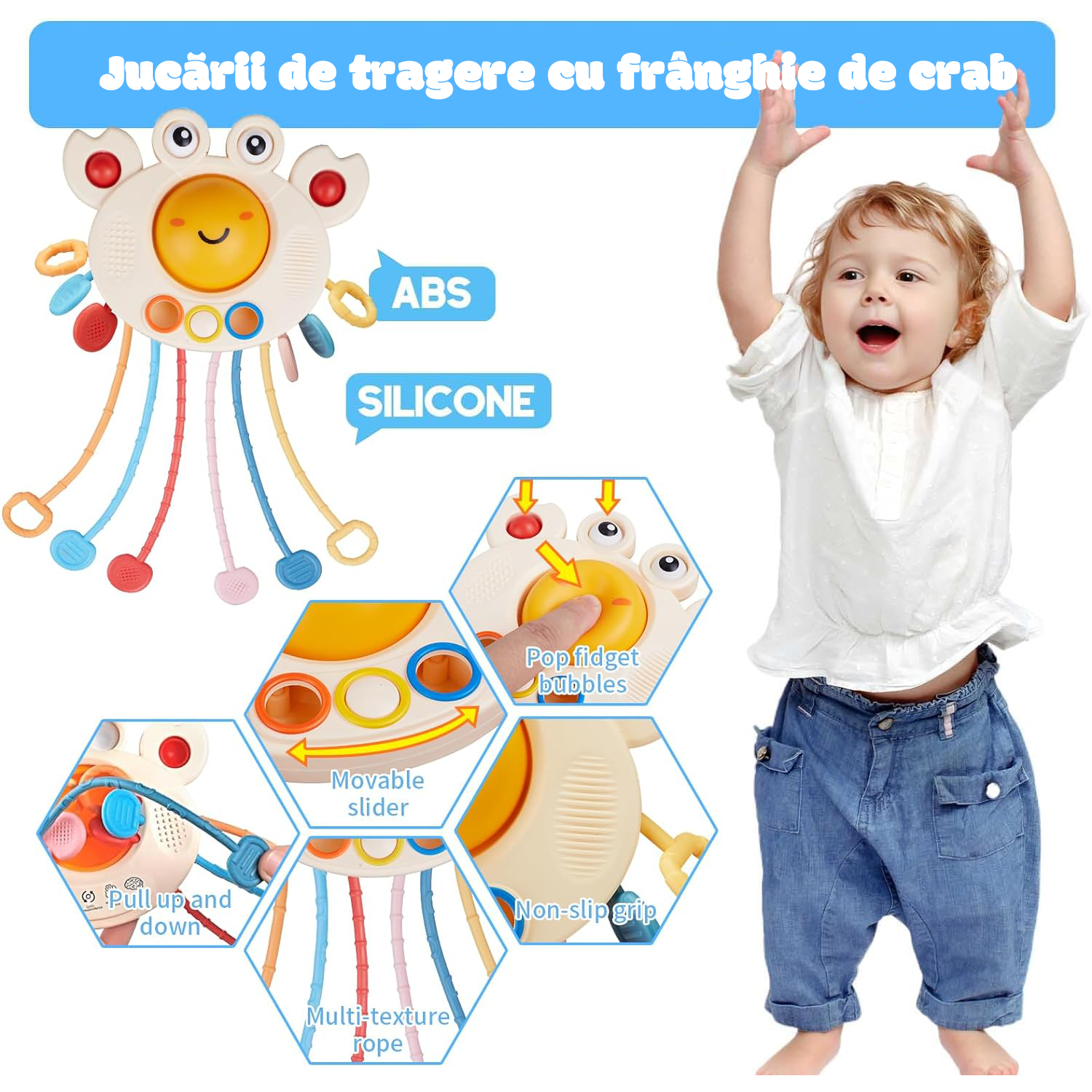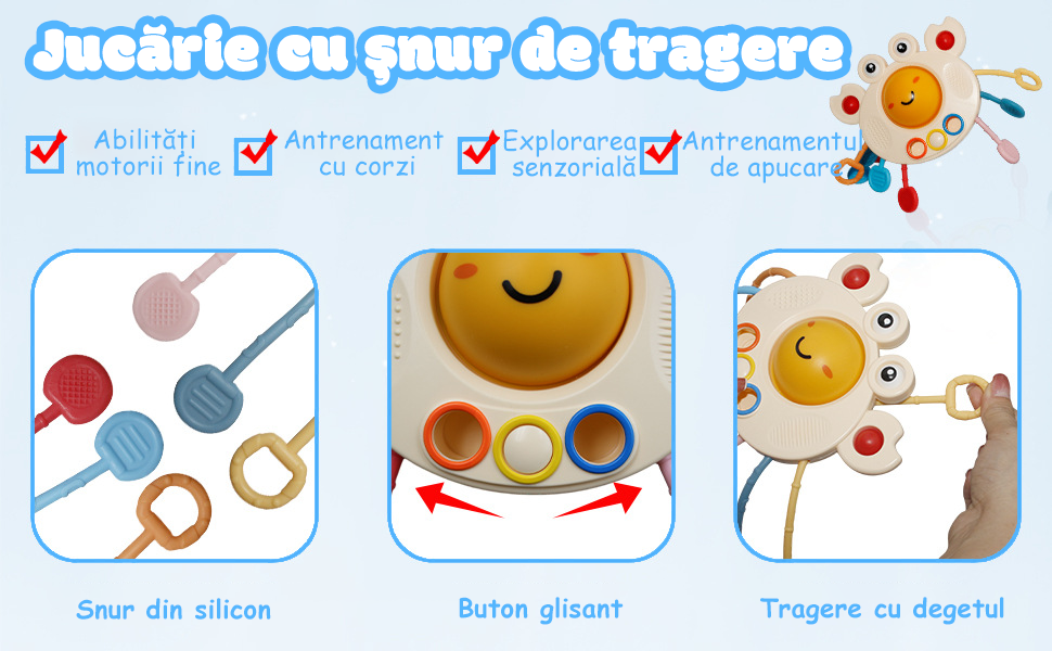 [Jucarie cu snur de tragere] jucarie interactiva pentru bebelusi pentru sugari cu sfoara de crab si jucarii cu ventuza pentru copii poate fi trasa, mestecata si presata pentru a ajuta bebelusii sa-si dezvolte abilitatile motorii ale degetelor si coordonarea mana-ochi. |