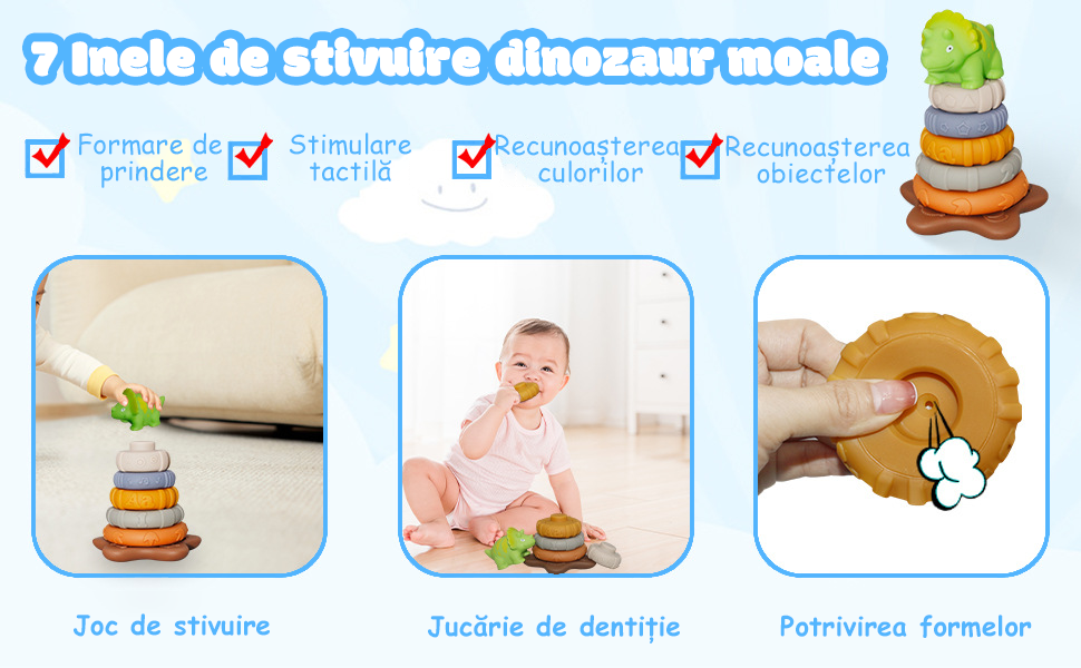 [Inele de stivuire dinozaur moale] Inelele de stivuire a dinozaurilor concepute cu litere, numere, texturi si modele de dinozauri in relief. Setul de jucarii senzoriale colorat ii ghideaza pe bebelusi sa exploreze lumea, ajutandu-i sa-si dezvolte abilitatile motorii fine, abilitatile cognitive si abilitatile sociale. |