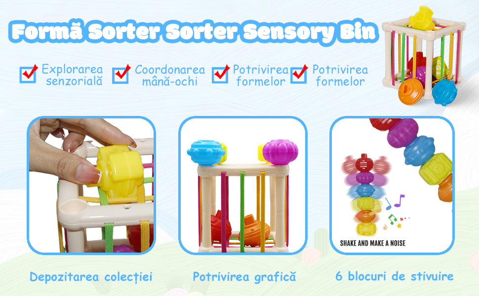 [Forma Sorter Sorter Sensory Bin] Sortatoarele de forme cu benzi elastice si spatii incurajeaza bebelusii sa exploreze si sa exerseze abilitatile motorii fine si brute, iar blocurile de constructie cu sunete pot exersa coordonarea audio-vizuala a mainii copilului tau. |