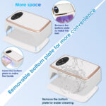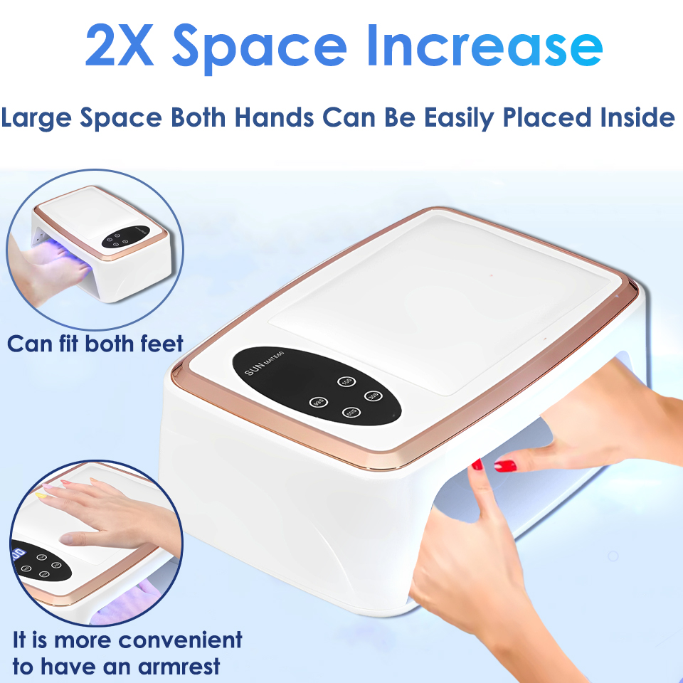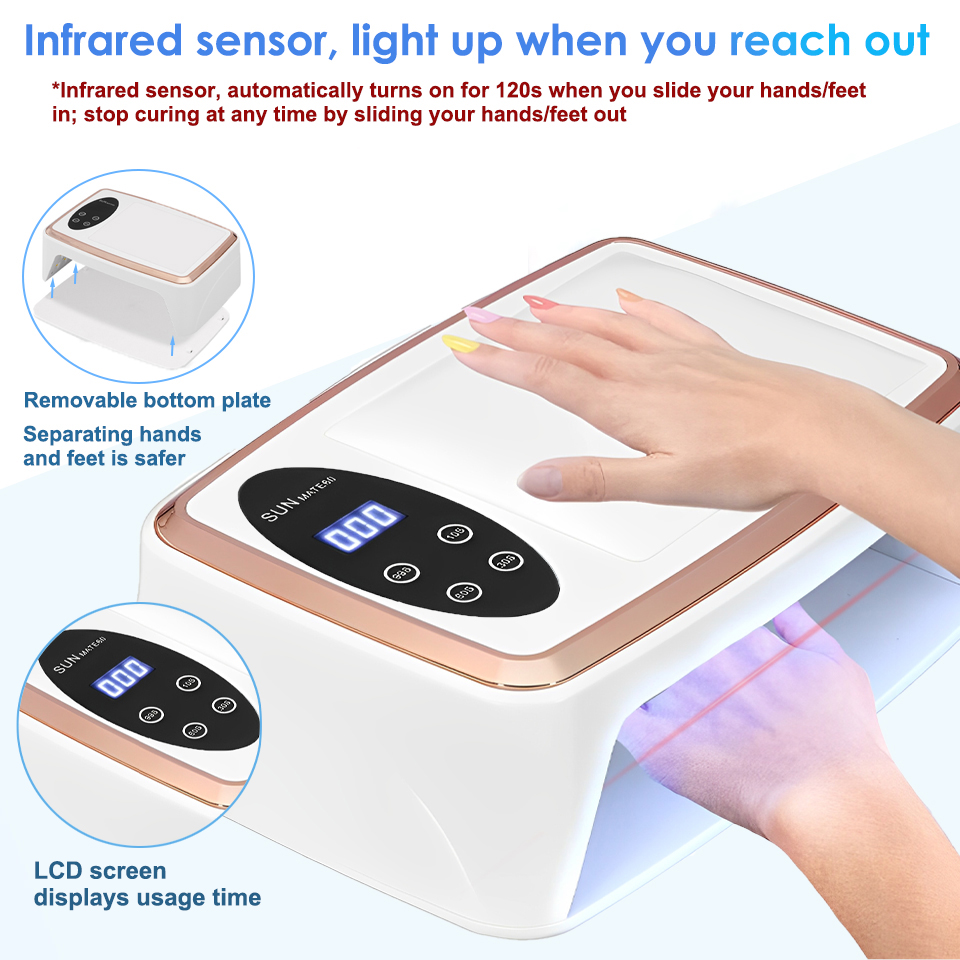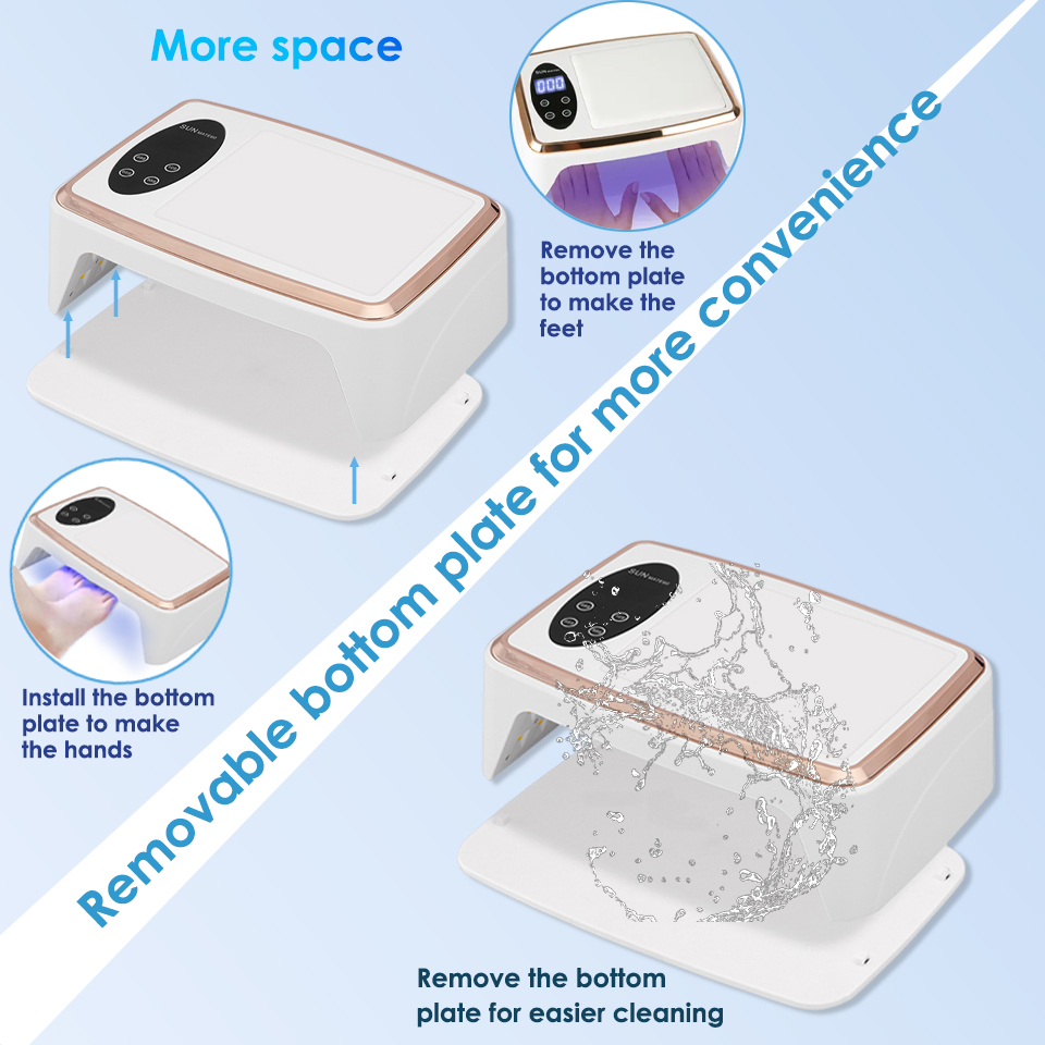| Combinatie perna pentru cotiera pentru unghii + lampa pentru unghii cu gel: Lampa Unghii UV LED adopta un design de spatiu mare si poate vindeca doua maini si doua picioare in acelasi timp. Este foarte potrivita pentru operatiuni eficiente de manichiura si poate economisi mai mult timp. Aceasta lampa profesionala asigura rezultate uniforme. Intarire eficienta si rapida: Lampa UV LED este echipata cu o putere de inalta eficienta de 380 W si 90 de margele luminoase LED de inalta calitate, asigurand ca lacul de unghii cu gel se usuca rapid si uniform, oferind o ingrijire completa. Puterea lacului de unghii este blanda, nu dauneaza pielii si se usuca rapid. Aceasta lampa uv ofera o polimerizare rapida si sigura. Afisaj mare si temporizator multifunctional: Lampa Unghii UV LED este echipata cu un afisaj LED mare si clar care poate afisa timpul de utilizare. Are patru setari de cronometru de 10 secunde, 30 de secunde, 60 de secunde si 99 de secunde, care pot controla cu precizie durata fiecarei intariri. Este, de asemenea, echipat cu un senzor automat, care se va aprinde automat timp de 120 de secunde cand mainile/picioarele intra in lampa unghii si se va opri intarirea dupa alunecare. Design convenabil de curatare: Vine cu o baza detasabila pentru indepartarea si curatarea usoara. Designul cu deschidere mare al lampa de unghii poate gazdui cu usurinta intreaga mana sau picior, evitand petele de lac de unghii si usurand curatarea. |