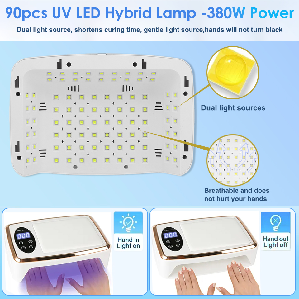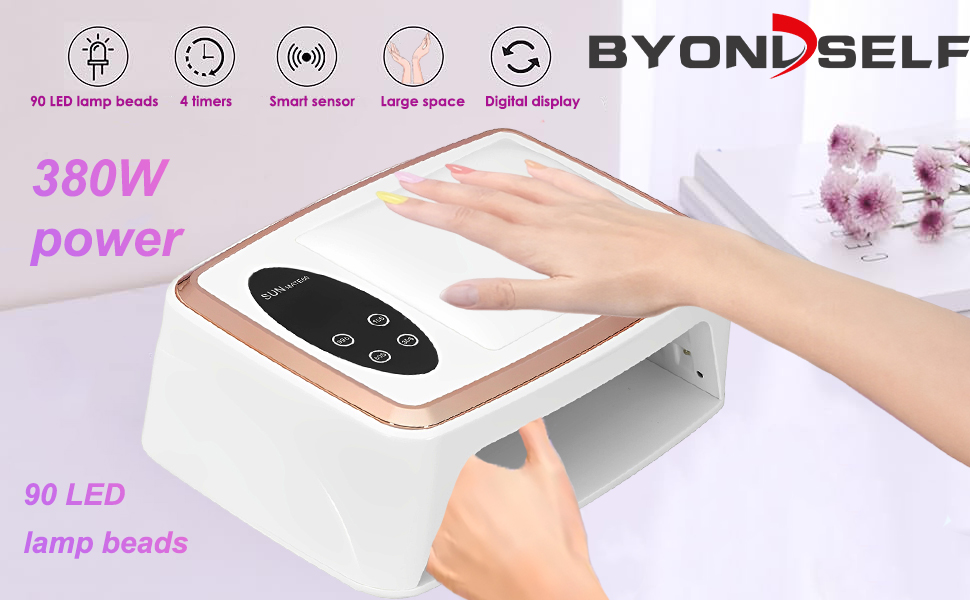 Lampa Unghii UV LED, BYONDSELF®, 380W, Suprafata Perna Confortabila, Spatiu Mare pentru Ambele Maini, cu 16 Pila Unghii, Cablu 1M, 10s/30s/60s/99s, 90 LED UV, LCD Afisaj Digital, Detectie Inteligenta, Alb