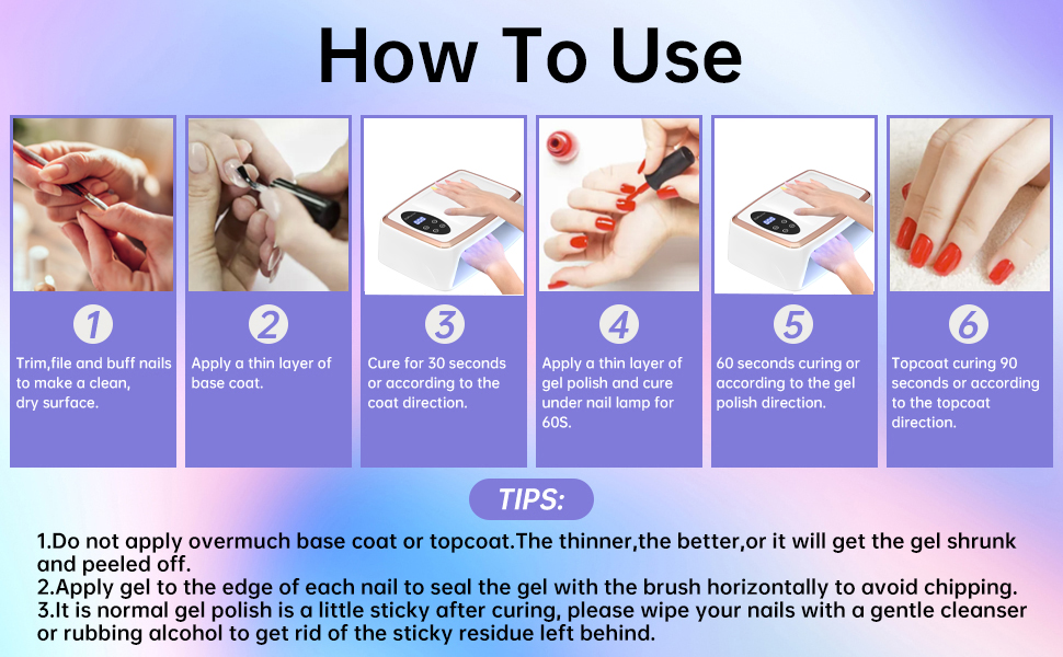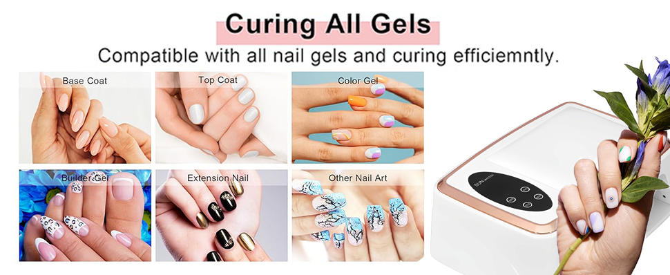 Potrivit pentru toate tipurile de lac de unghii cu gel, inclusiv strat superior, gel colorat, strat de baza etc., fara restrictii de marca. Capabil sa foloseasca gel de tratament UV, gel de extensie, lac de unghii cu LED, gel dur, gel de sculptare si multe alte tipuri cu lampa uv unghii. |