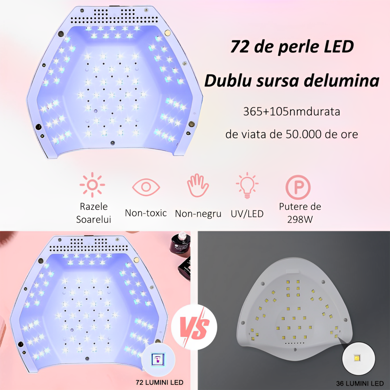 Descoperiti puterea revolutionara a Lampa Unghii de 298W, echipata cu 72 de bijuterii de lumina. Aceasta Lampa Profesionala asigura o uscare rapida si uniforma a gelului, fiind ideala pentru orice tip de manichiura. Cu tehnologia avansata a Lampa Profesionala Unghii UV LED, fiecare unghie va straluci de frumusete, oferind rezultate de salon la domiciliu. Indiferent de tipul de gel folosit, aceasta lampa va transforma fiecare aplicare intr-o experienta perfecta. 【Compatibilitate Universala】 Aceasta lampa este conceputa pentru a fi compatibila cu toate tipurile de geluri pentru unghii. Nu mai trebuie sa va faceti griji cu privire la incompatibilitatea produselor, deoarece Lampa Profesionala functioneaza perfect cu orice tip de gel, fie ca este vorba despre geluri colorate sau transparente. Creati manichiuri uimitoare si durabile, utilizand aceasta lampa de inalta calitate care va aduce rezultatele dorite rapid si eficient. |