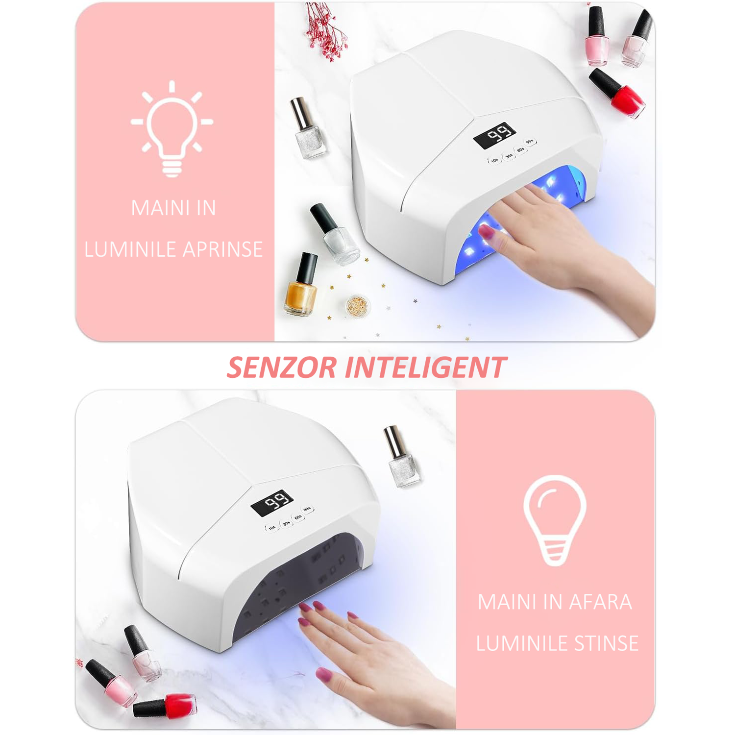 Un alt avantaj al acestei lampi este fundul detasabil, care ofera mai mult spatiu pentru aplicarea gelului. Acest aspect practic permite o utilizare mai usoara si confortabila a Lampa Unghii, facilitand accesul la unghii. Fie ca lucrati pe maini sau picioare, acest design inovator asigura ca fiecare unghie beneficiaza de o expunere optima la lumina, maximizand eficienta procesului de uscare. 【Timp de Uscare Personalizabil、Senzor Inteligent】 Cu cele patru setari de timp disponibile, aceasta lampa permite utilizarea personalizata in functie de preferintele fiecaruia. Alegeti intre 10S, 30S, 60S sau 99S pentru a obtine rezultatele dorite. In plus, senzorul inteligent activeaza Lampa Profesionala Unghii automat atunci cand introduceti mainile, asigurand o experienta hands-free. Aceasta Lampa Profesionala este perfecta pentru toate nevoile dumneavoastra de manichiura! Va rugam sa aveti in vedere Lampa noastra de unghii este o lampa profesionala de mare putere. Daca aveti pielea sensibila: 1. Inainte de utilizare, puteti aplica crema de soare, crema hidratanta sau purta manusi anti-UV pe pielea mainilor, lasand doar unghiile expuse la lumina, pentru a reduce daunele cauzate de UV asupra pielii. 2. Incercati sa evitati expunerea mainilor la lumina pentru perioade indelungate, respectand timpul de intarire specificat pentru oja sau gel, de obicei intre 30 si 90 de secunde. 3. Pozitionati degetele in locatia corecta din lampa, evitand contactul direct al pielii cu tubul sau cu becurile. Daca aveti dermatita alergica, piele fotosensibila, boli de piele cronice, infectii ale unghiilor sau pielii, leziuni ale pielii, 4. In timpul utilizarii lampii de unghii, daca observati roseata, mancarime sau alte reactii neplacute ale pielii, opriti imediat utilizarea si spalati bine mainile. |