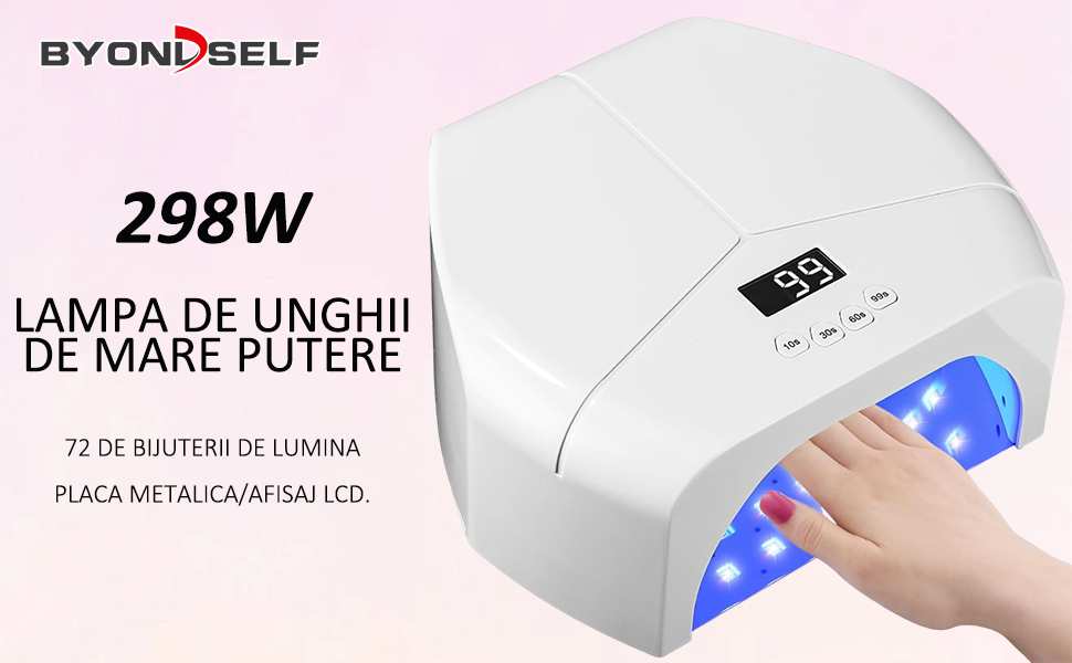 Lampa Unghii UV LED, BYONDSELF®, 72 LED UV, 298W, 4 Temporizatoare, cu Impingator Cuticule si 3 Pila Unghii, Cablu 1M, Uscare Extreme Speed, Senzori Inteligenti, pentru Manichiura Salon, Alb