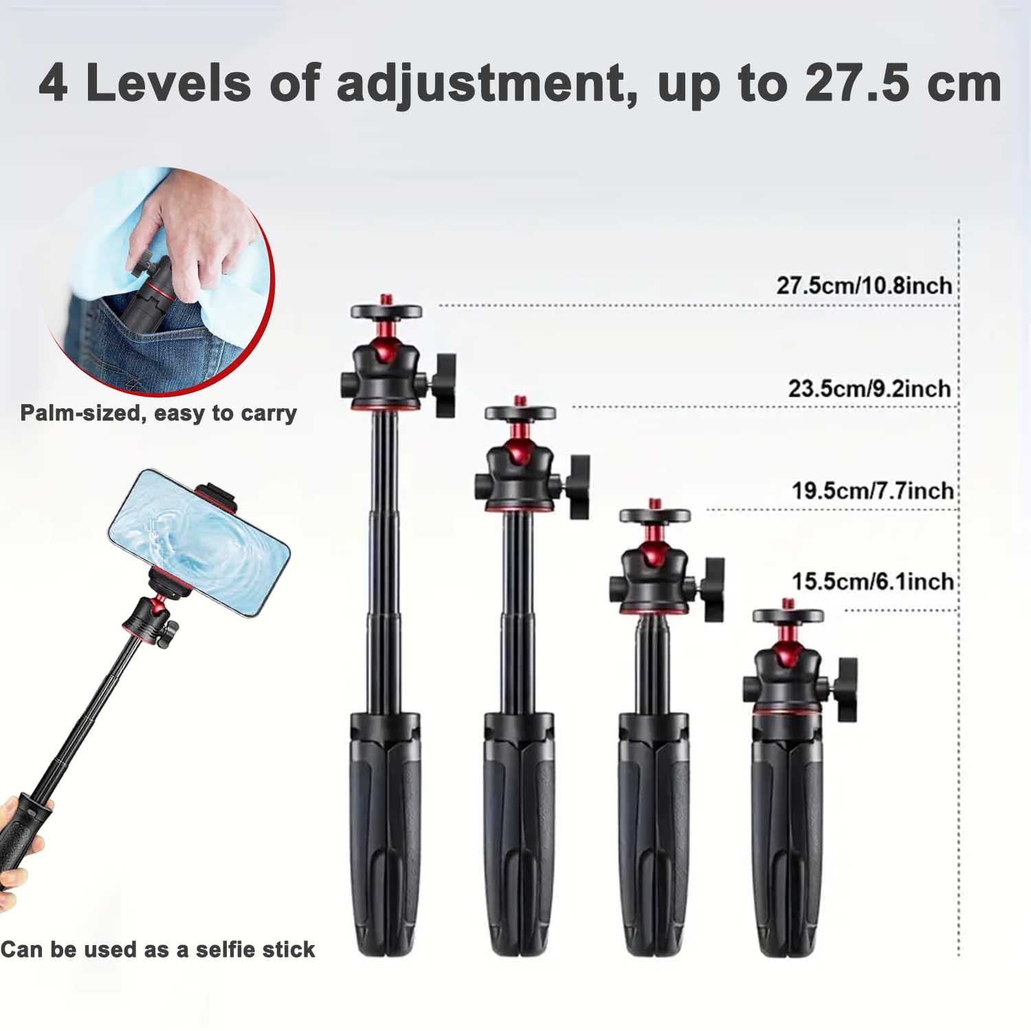 Deblocarea cu o singura atingere va permite sa reglati inaltimea la patru niveluri: 15,5 cm/19,5 cm/22,5 cm/27,5 cm. Puteti comuta intre macro-unghiul mic de pe desktop si perspectivele de fotografiere in picioare, dupa cum doriti, pentru a raspunde nevoilor mai multor scenarii, cum ar fi selfie-uri, fotografii cu alimente si inregistrari de intalniri. |