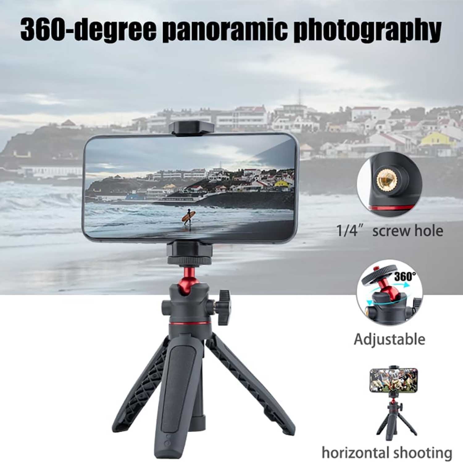Mini Trepied foloseste un cadru din aliaj de aluminiu de calitate pentru aviatie + folie flexibila din silicon anti-zgarieturi, care este robusta si rezistenta la impact, cantareste doar 96 de grame (suplimentat efectiv) si poate fi pus cu usurinta intr-un buzunar sau rucsac, facand fotografia de calatorie in aer liber o experienta fara povara. Gimbal rotativ la 360°, deblocand unghiuri creative Trepied pentru telefon si camera foloseste un cap sferic care accepta rotirea la 360° atat in directia orizontala, cat si in cea verticala. Puteti regla cu usurinta unghiul de inclinare pentru a face fotografii cu unboxing, cladiri si transmisiuni live. Poti trage orice vrei! |