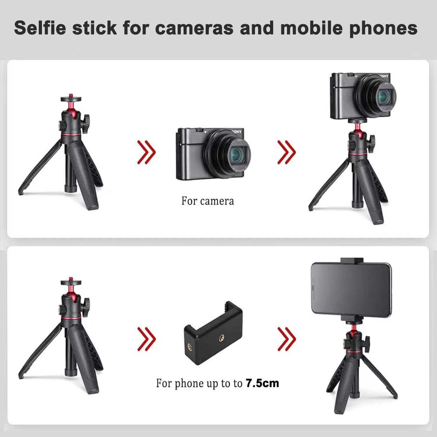 Poate fi folosit pentru camere mici, suportul pentru telefon se extinde pana la 7,5 cm, fiind potrivit pentru majoritatea smartphone-urilor. Portul cu surub 1/4 accepta echipamente precum lumini de umplutura, microfoane portabile si altele – un singur produs cu multiple utilizari si raport pret-calitate exceptional! Indiferent daca explorati muntii in drumetii, testati cafenele sau creati acasa, acest trepied mini va devine „asistent foto invizibil”, stabilizand fiecare cadru pentru imagini cristaline. Realizati cu usurinta lucrari de nivel profesional! |