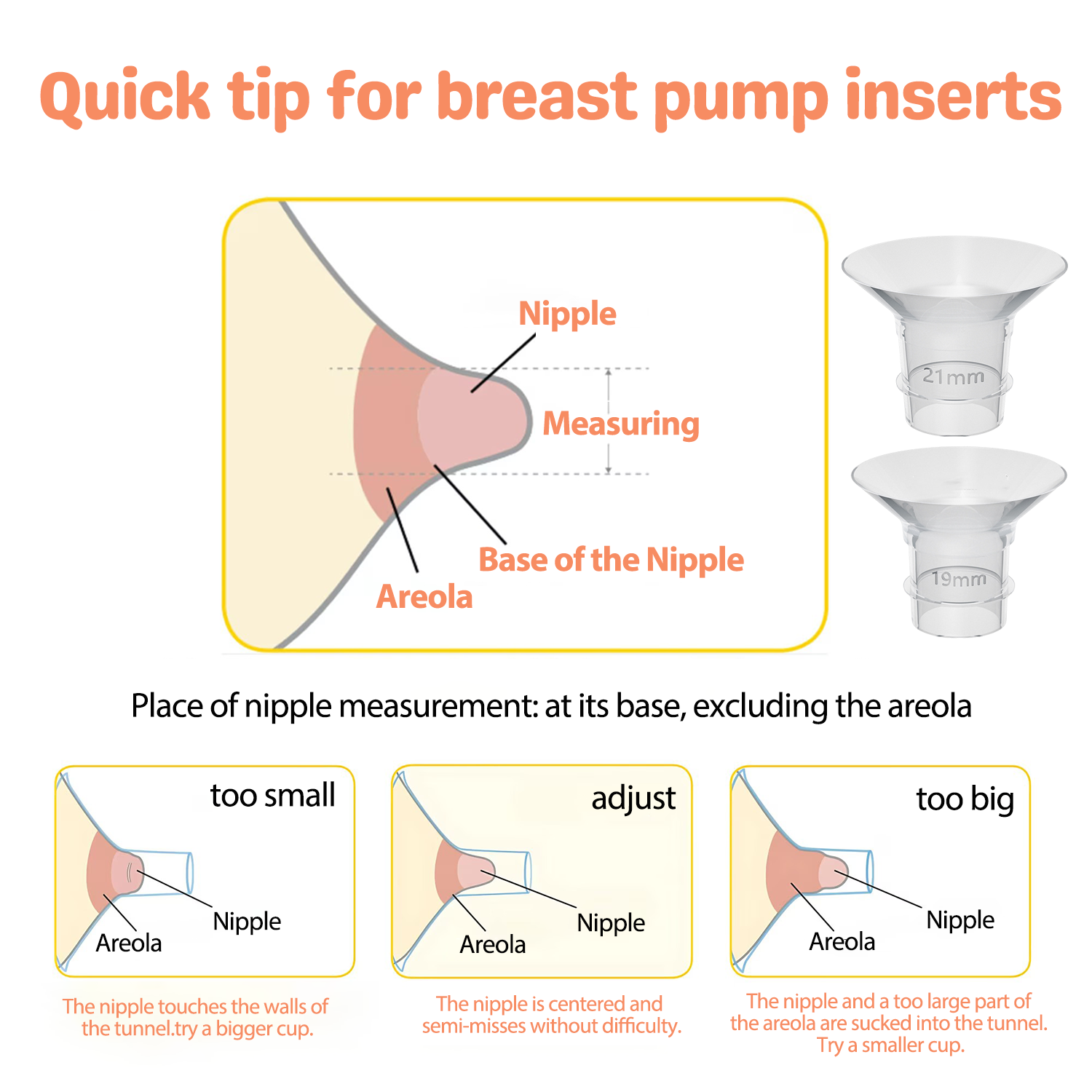 Pentru a alege dimensiunea corecta a flansei pentru pompa de san, stimulati usor mamelonul pentru a-l face sa se ridice, apoi masurati-i diametrul folosind o rigla. Flansa ar trebui sa fie cu 1-2 milimetri mai mare decat mamelonul dvs. pentru a asigura confort si aspiratie eficienta. O potrivire adecvata ajuta la prevenirea durerii la mamelon si a productiei slabe de lapte. |