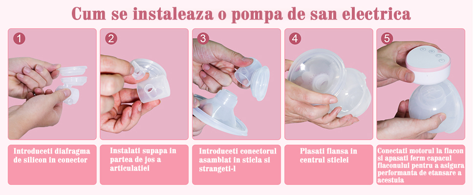 Cum se instaleaza o pompa de san electrica? 1. Introduceti folia de silicon in conector 2. Instalati supapa in partea de jos a conectorului 3. Introduceti conectorul asamblat in sticla si strangeti-l 4. Plasati flansa in centrul Taiwan 5. Conectati motorul la flacon si apasati ferm capacul pentru a asigura performanta de etansare a acestuia |