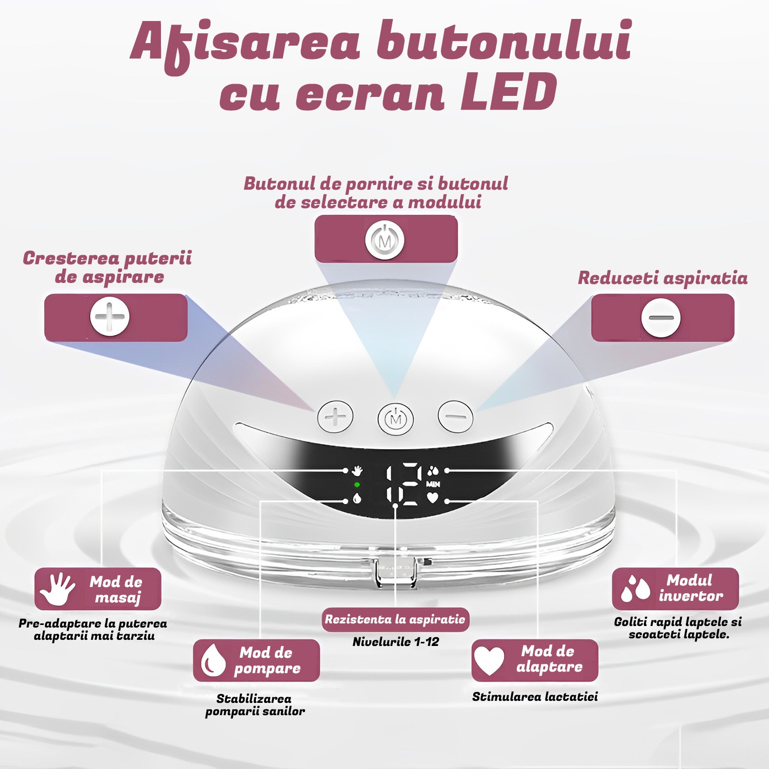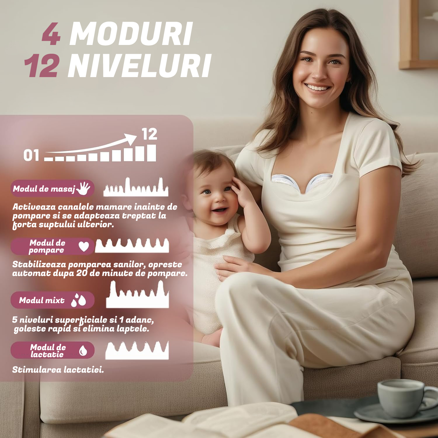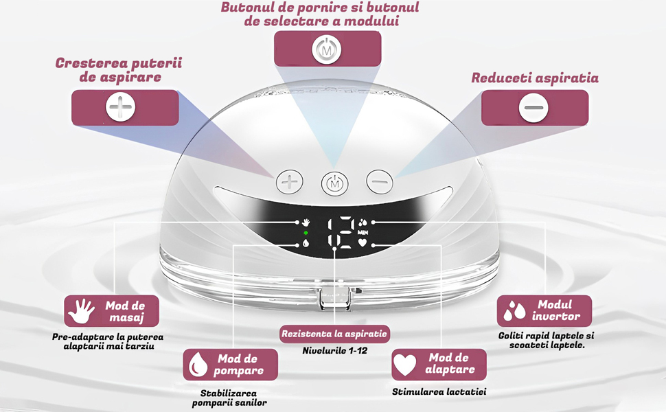4 moduri si 12 niveluri: Aceasta pompa de san electrica dubla are 4 moduri (modul masaj, modul alaptat, modul de conversie a frecventei, modul de aspirare) si 12 functii de reglare a treptelor de viteza, permitand fiecarei mame sa gaseasca un sentiment confortabil in timpul alaptarii.