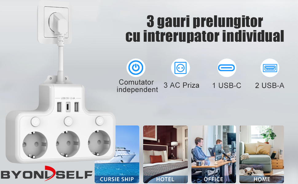 Prelungitor 4000W, 3 Prize/2 USB-A/1 USB-C, BYONDSELF®, 3 Intrerupator Individuel, Priza multipla Murale, Alb