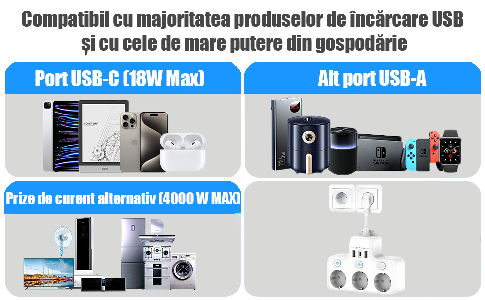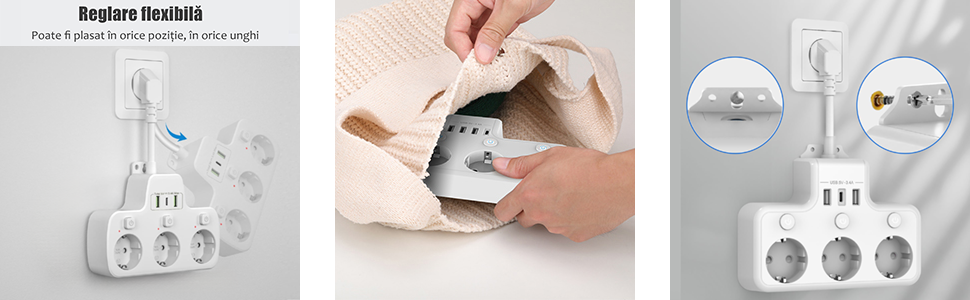 Aceasta priza multipla este dotata cu 3 prize standard UE si 3 porturi USB, inclusiv 2 USB-A si 1 port type-C, satisfacand astfel nevoile de incarcare ale tuturor dispozitivelor dumneavoastra, de la telefoane la casti. |
