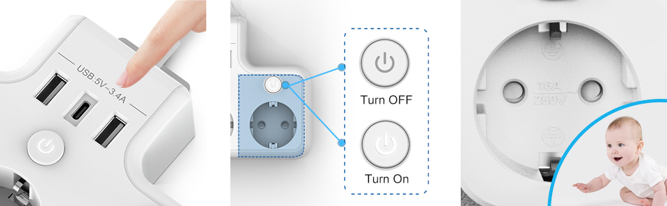 Cele doua porturi USB-A si portul type-C sunt capabile sa recunoasca automat dispozitivele conectate pentru a optimiza viteza de incarcare. Este ideal pentru telefoane, tablete, difuzoare Bluetooth si multe altele. 【Control individual】 Fiecare priza este prevazuta cu un intrerupator propriu, astfel incat puteti opri doar dispozitivul dorit fara a deconecta complet toate echipamentele, optimizand siguranta si economisind energie. 【Protectie pentru copii】 Este prevazuta cu o usa de protectie care previne riscurile de soc electric, fiind necesara introducerea corecta a ambilor poli pentru activare. |