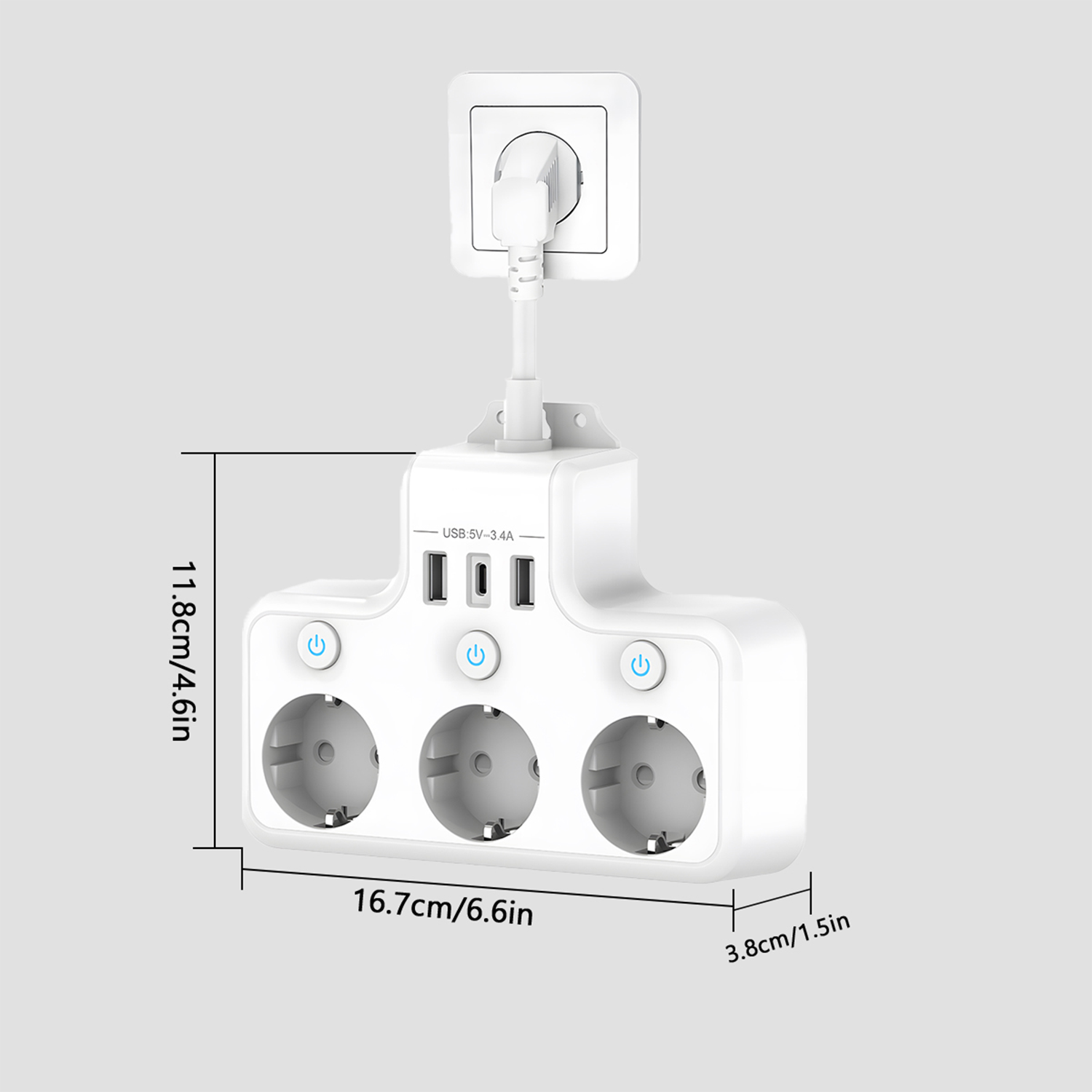 Aceasta priza multipla este dotata cu 3 prize standard UE si 3 porturi USB, inclusiv 2 USB-A si 1 port type-C, satisfacand astfel nevoile de incarcare ale tuturor dispozitivelor dumneavoastra, de la telefoane la casti. |