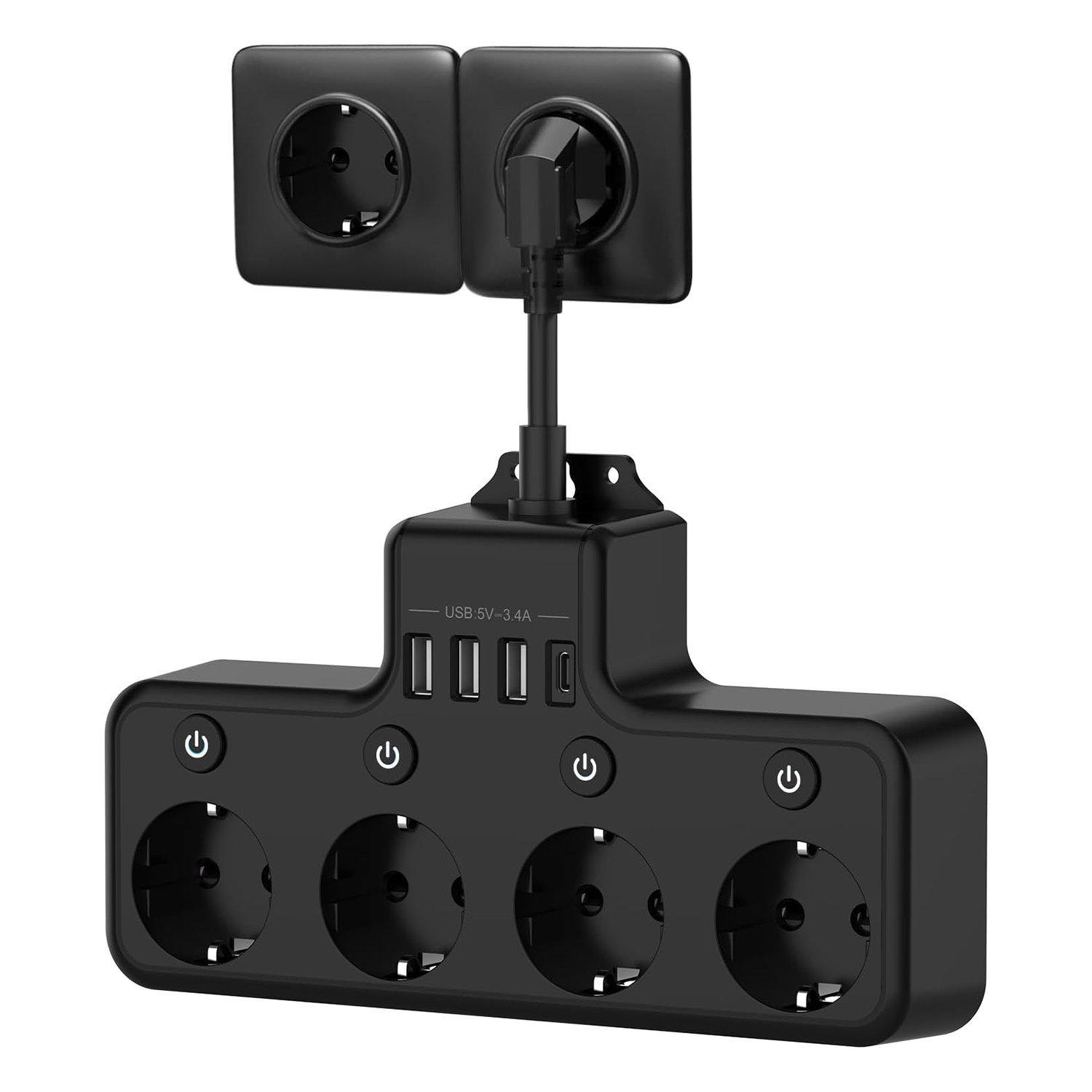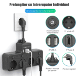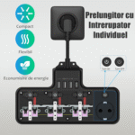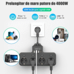 Prelungitor 4000W, 4 Prize/3 USB-A/1 USB-C, BYONDSELF®, 4 Intrerupator Individuel, Priza multipla Murale, Negru