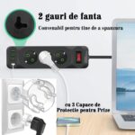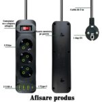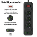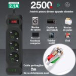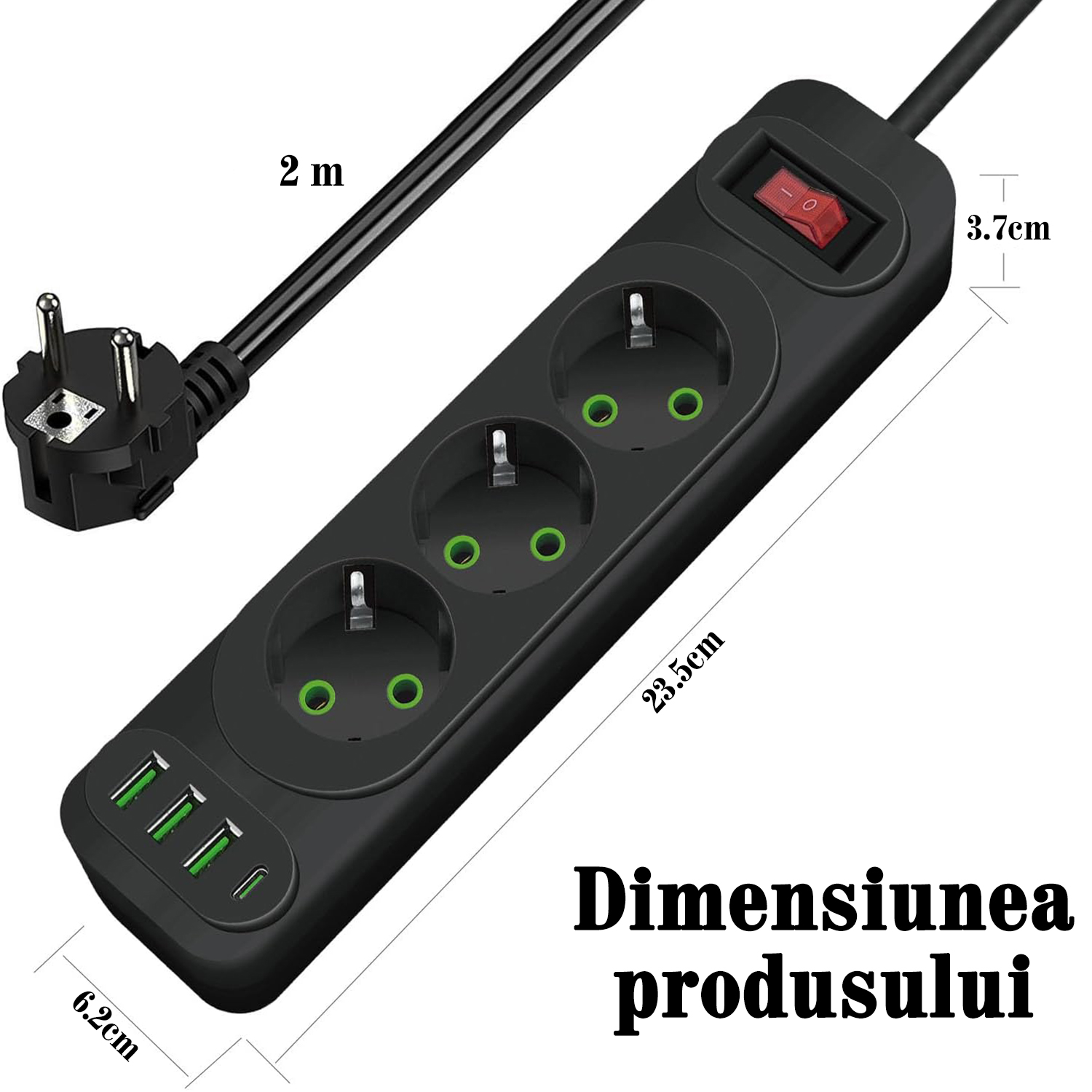 Prelungitor, BYONDSELF®, 2500W, 3 USB A, 1 USB C, 2M, 3 Prize, cu 3 Capac Anti-atingere Accidentala pentru Copii, Negru