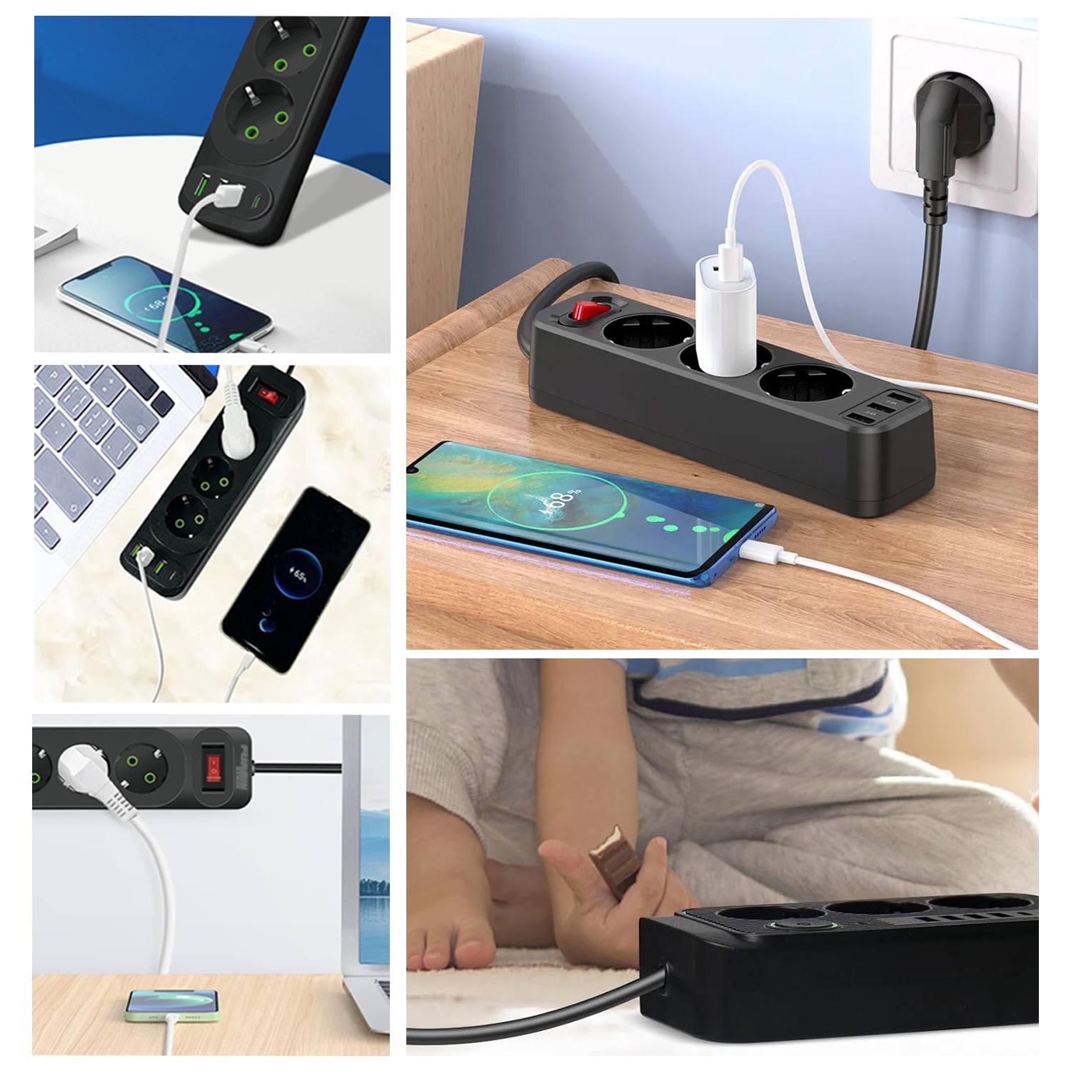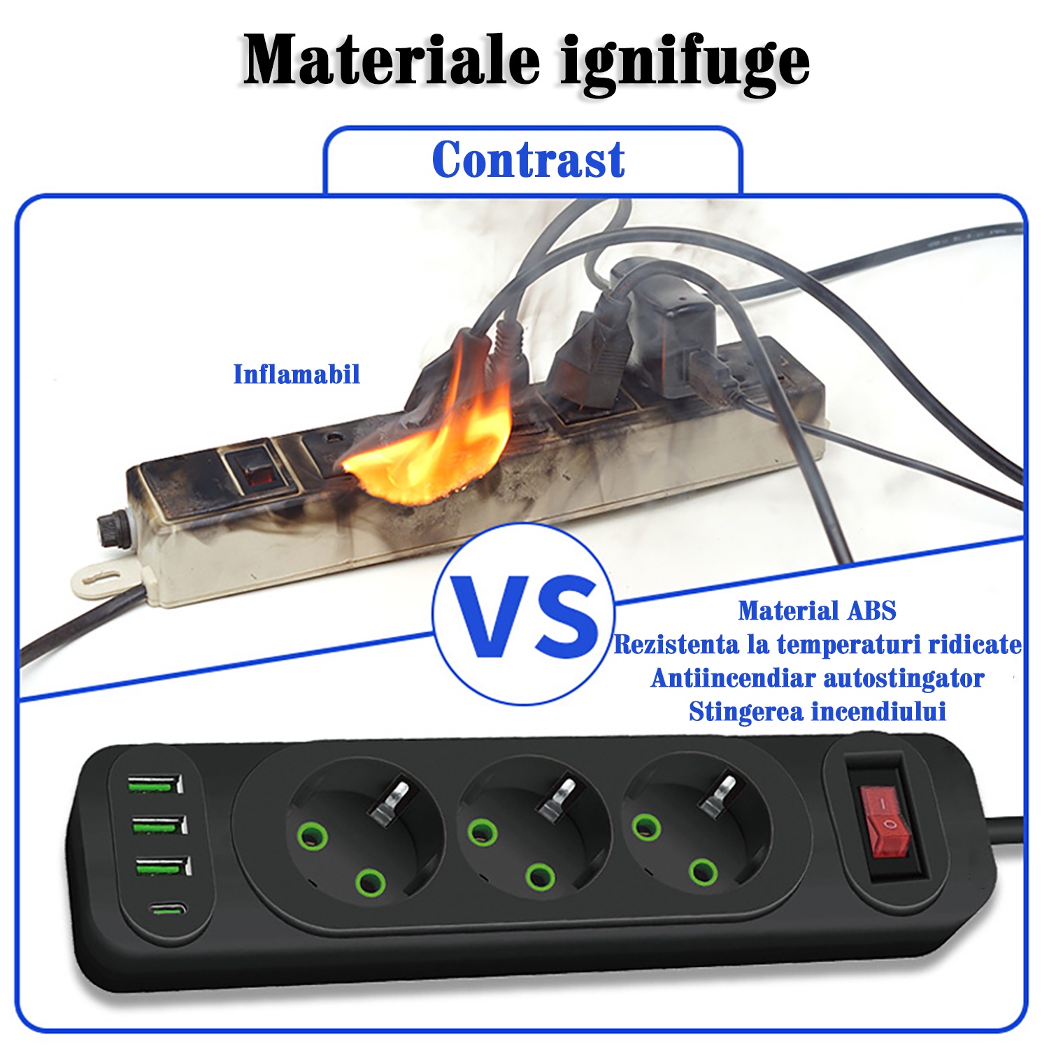 Acest prelungitor este echipat cu 3 prize, 3 interfete USB-A si 1 interfata Type-C. Interfatele multiple pot satisface nevoile de incarcare ale diferitelor dispozitive si pot, de asemenea, incarca mai multe dispozitive simultan, facandu-l mai convenabil. |