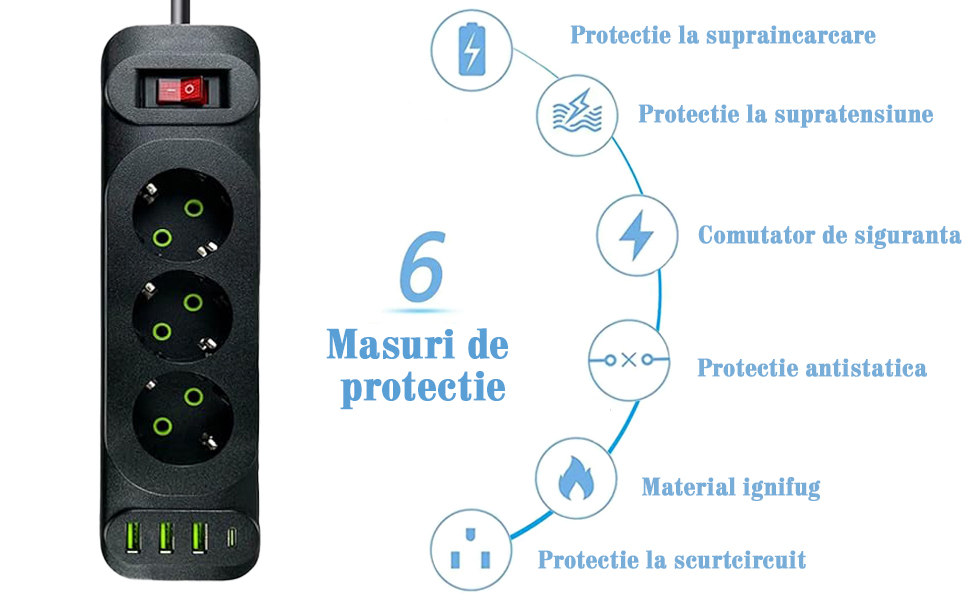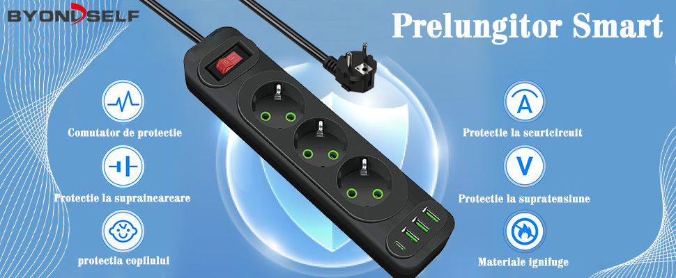 Acest prelungitor nu numai ca va satisface nevoile de baza de energie, ci ofera si alte sase straturi de masuri de securitate. Prelungitor smart este fabricat din materiale de inalta calitate si are multiple functii de protectie, cum ar fi protectia la suprasarcina, protectia la fluctuatii de tensiune, antistatica, protectia comutatorului de siguranta, ignifuga si protectia la incendiu si protectia la scurt circuit, care pot asigura siguranta electrica a dvs. si a familiei dvs. |