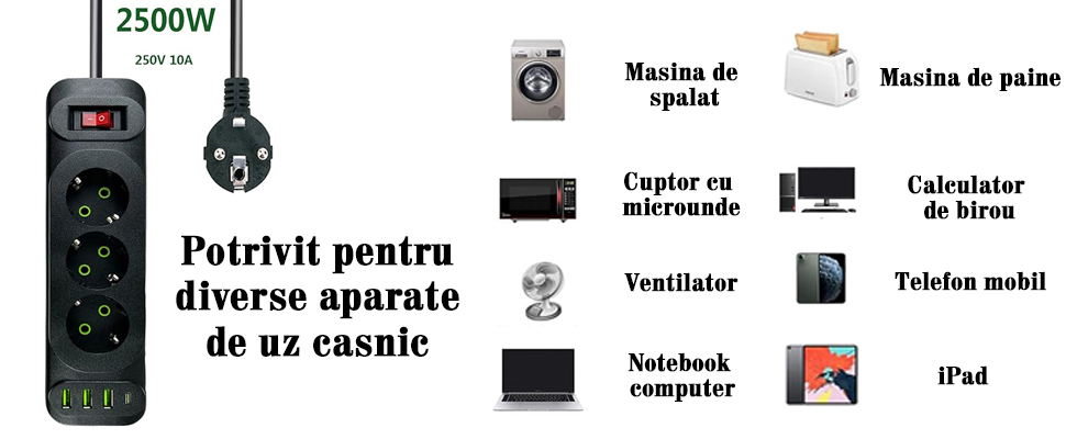 Aceasta prelungitor adopta iesire de mare putere si sprijina utilizarea simultana a mai multor aparate, indiferent daca este o masina de spalat, cuptor cu microunde, ventilator electric, laptop, filtru de paine, computer desktop, telefon mobil sau tableta, poate fi utilizata pentru un consum de energie mai flexibil. |